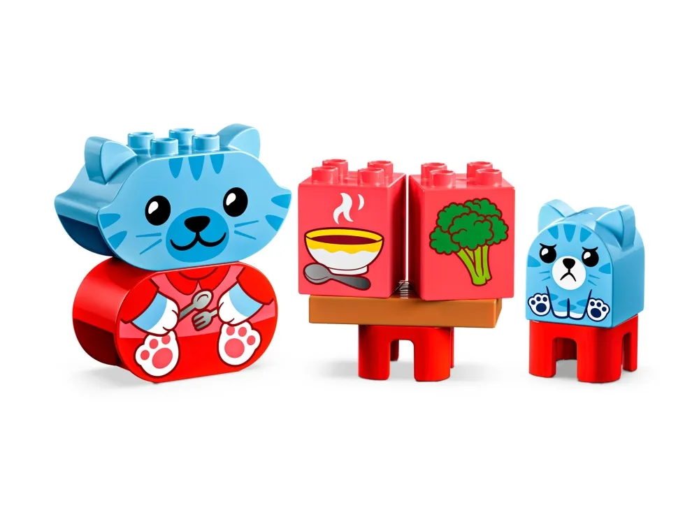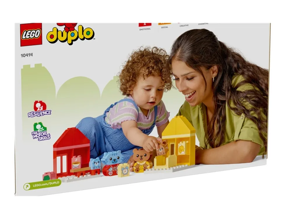 Auta lapsia ymmärtämään tunteitaan LEGO® DUPLO® Ensimmäiset päivätoimeni – Ruokailu ja nukkumaanmeno (10414) lelun parissa. Hauska lelu sopii alle kouluikäisille lapsille 1½-vuotiaasta alkaen. Setti sisältää 4 eläinhahmoa, joihin on helppo samaistua. Nukkumaanmeno ja ruokailu voivat herättää erilaisia tunteita perheen pienimmissä. Tämän oppimislelun parissa lapset voivat tutkia tunteitaan leikkien lomassa. Setti sisältää 2 suloista eläinperhettä, joissa molemmissa on aikuinen ja lapsi. Kissanpennun ja karhunpennun hahmoilla on 2 erilaiset kasvot – iloiset toisella puolella ja surulliset toisella. Näiden ilmeiden avulla puhumaan opettelevat lapset voivat ilmaista tunteitaan. LEGO DUPLO settien parissa lapset oppivat uutta leikkien lomassa. Hauskoissa interaktiivisissa roolileikeissä vanhemmat voivat lelujen avulla kertoa lapsille rutiinien tärkeydestä. Perheen pienimpien hienomotoriset taidot karttuvat, kun lapset rakentavat värikkäistä palikoista 2 taloa. Rutiineja kuvastavat rakennelmat ovat erivärisiä, joten rakentelu sujuu leikiten.