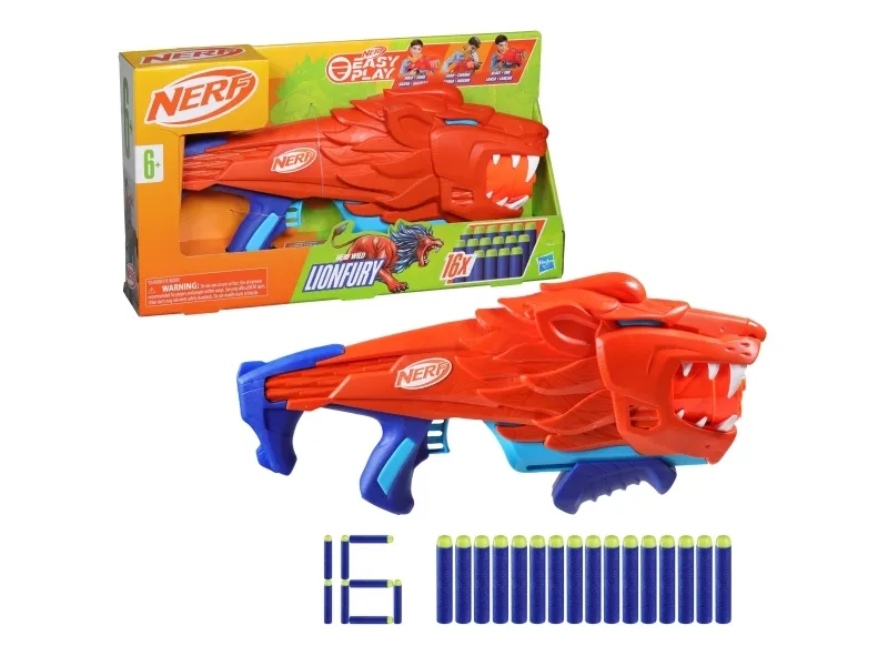 Nerf Junior Wild blasters are designed with special features that make them easy to play with, so young kids can enjoy playing with these wild-looking blasters all by themselves. They're easy to hold, sized to fit comfortably in small hands, and lightweight for easy carrying in backyard games. The front-loading design makes it easy to insert darts, and the handles have the lowest pull force of any Nerf dart blasters, for easy blasting. All these features let kids experience the thrill of blasting all by themselves. They're perfect for boys and girls who are blasting into Nerf dart games for the first time. The Nerf Junior Lionfury blaster features an awesome lion design that captures the look of this ferocious feline with vibrant colors and exciting details! This Nerf blaster lion toy includes 16 Nerf Elite 2.0 flexible foam darts. Eyewear recommended (not included). Blasters each sold separately, subject to availability.Nerf Junior Wild Lionfury. Product type: Toy blaster, Recommended age (min): 6 yr(s), Recommended age (max): 99 yr(s), Product colour: Multicolour. Weight: 703 g