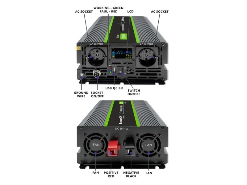 The Qoltec inverter is a device that changes the 24 V direct voltage from the car installation to 230 V alternating voltage. It is ideal where there is no direct access to the power grid. The product has built-in mains sockets compatible with European plugs and a USB port.