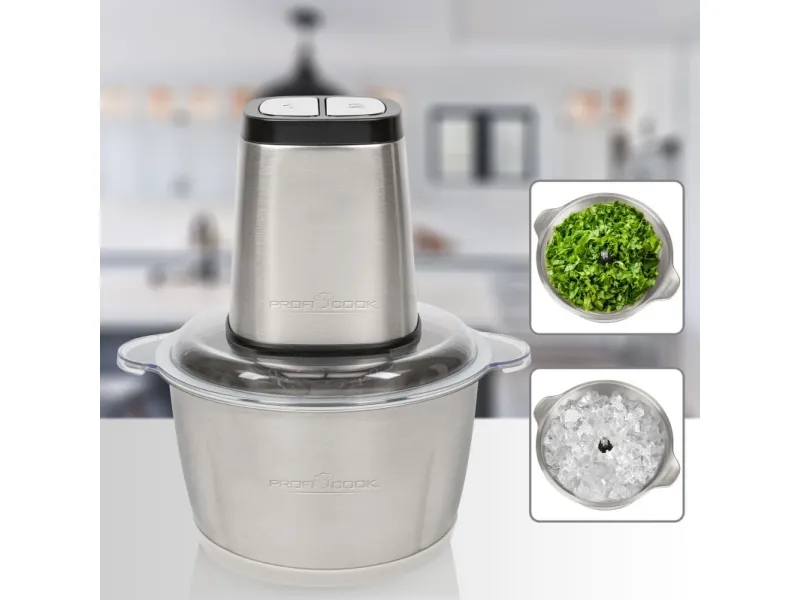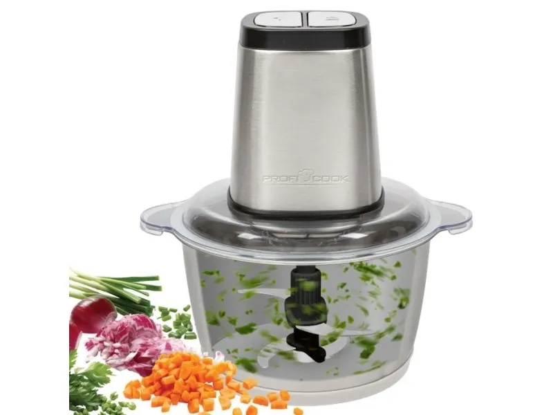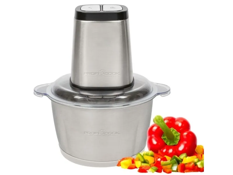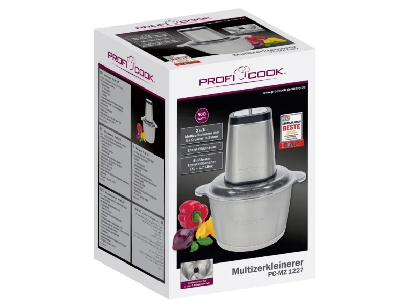 Clatronic PC-MZ 1227. Bowl capacity: 1.7 L. Product colour: Stainless steel, Bowl material: Glass, Blade material: Stainless steel. Power: 500 W, AC input voltage: 220–240, AC input frequency: 50 - 60 Hz. Width: 220 mm, Depth: 250 mm, Height: 180 mm. Package depth: 265 mm, Package height: 183 mm, Package weight: 1.7 kg
