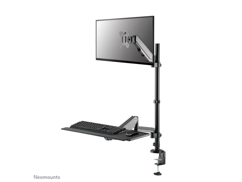 The Neomounts DS90-325BL1 is a full-motion height-adjustable desk mounted workstation for screens up to 32", keyboard and mouse. The mount can support screens up to 9kg (curved: 6kg), while the keyboard tray can support max. 1kg. The versatile tilt (70°), rotate (360°) and swivel (180°) technology allows the monitor arm to change to any viewing angle to fully benefit from the capabilities of the screen. The keyboard tray includes a wrist support and mouse pad for optimum comfort. The workstation desk mount has a large height adjustability range from 44-95 cm and can be used both seated and standing. To ensure quick repositioning and the most optimal working position, the DS90-325BL1 features gas spring height adjustment for both the monitor arm and keyboard tray arm. The smart cable management system ensures orderly routing of the cables. The DS90-325BL1 is suitable for screens that meet VESA hole pattern 75x75 or 100x100mm and is equipped with a Quick-release VESA system for fast and easy installation.