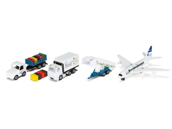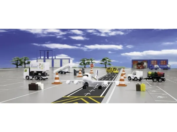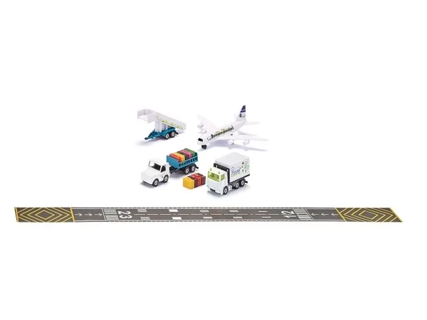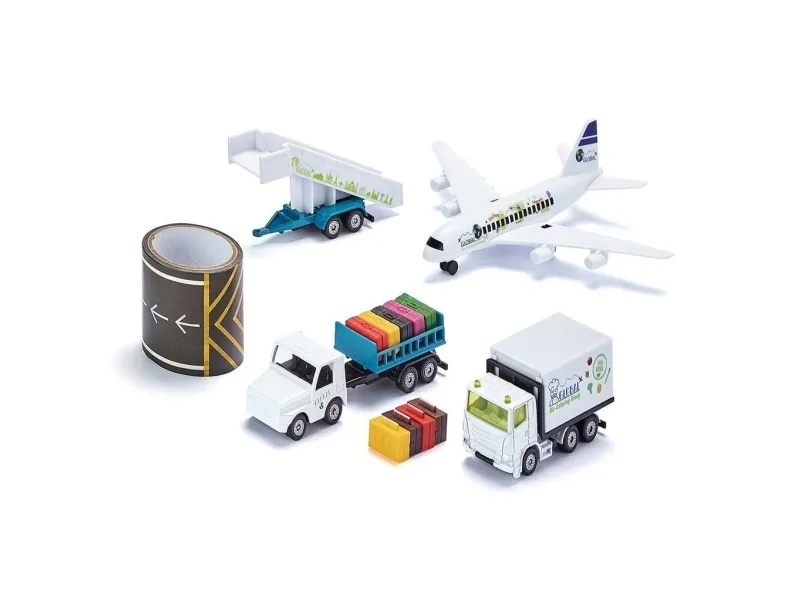 Detailed airport set with a wide range of features: Airport tractor with trailer hitch, Height-adjustable luggage trailer, Hitchable passenger stairs, Openable suitcases, Tape with runway markings. Highly durable: Box body made of metal and plastic with flaps, airport tug made of metal, passenger stairs made of metal and plastic. Perfect complement to the new SIKU World commercial aircraft (siku 5402) - sold seperately. Material: metal/plastic, Dimensions: 35.5 x 6.0 x 21.0 cm.