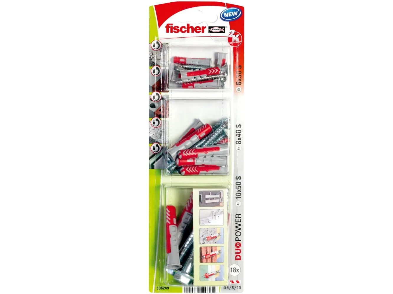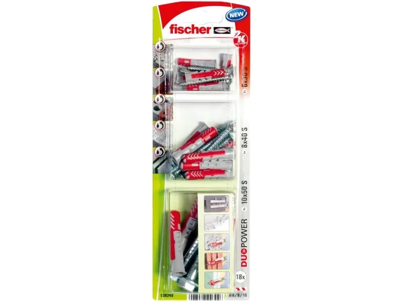 Fischer 536249. Product type: Wall plug, Suitable for materials: Brick, Concrete. Quantity per pack: 18 pc(s), Package type: Blister