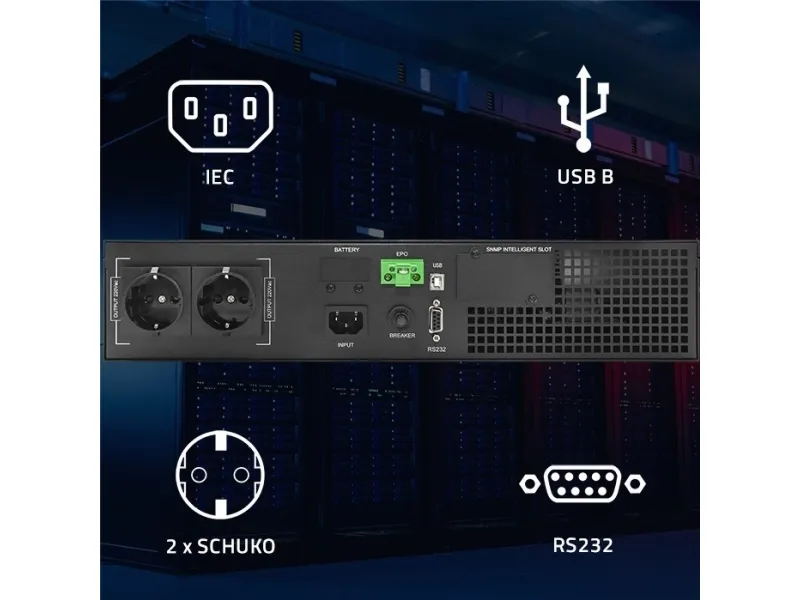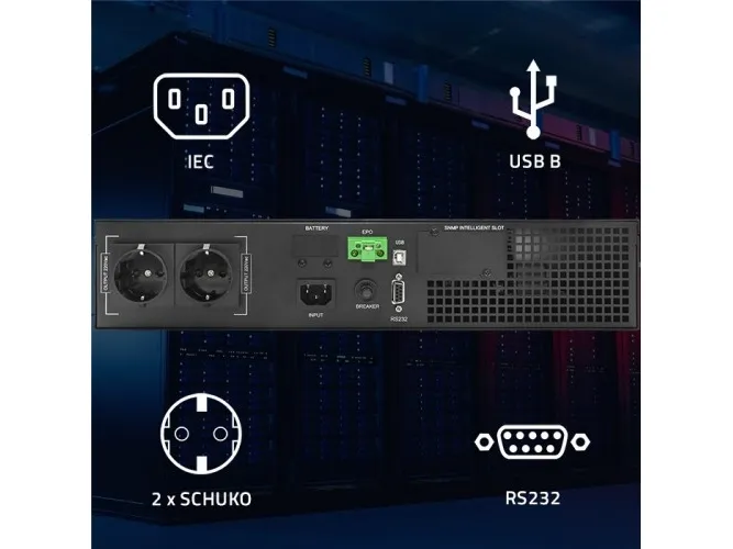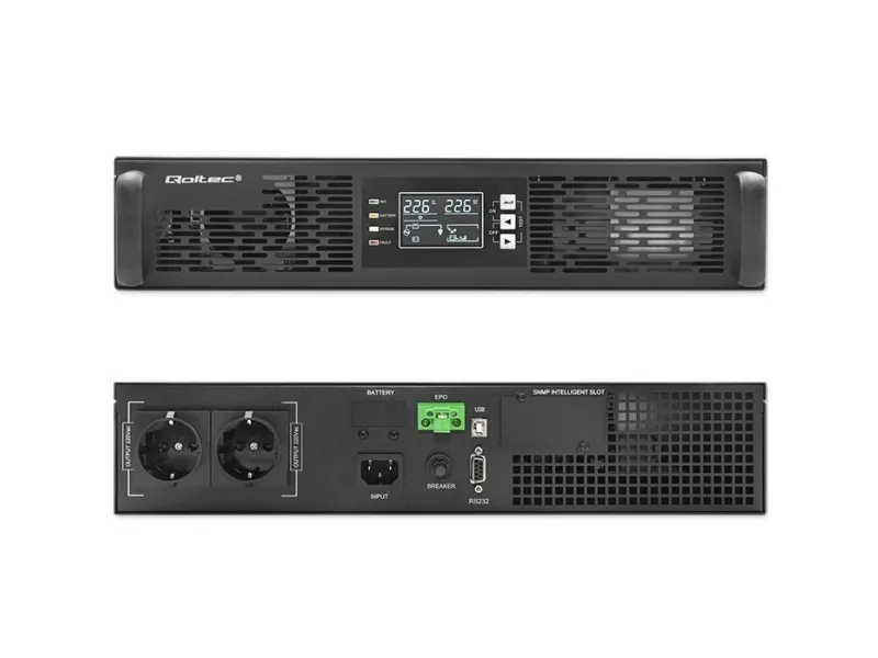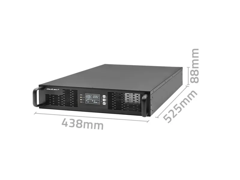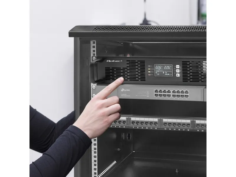 Qoltec RACK UPS units offer stable interference-free pure sine wave power. It's complete protection for your devices, thanks to the double conversion, which first converts the AC of the mains supply to DC and then to AC, ensuring the highest level of power quality and protecting against potential mains disturbances such as voltage drops, power outages, surges and failures.