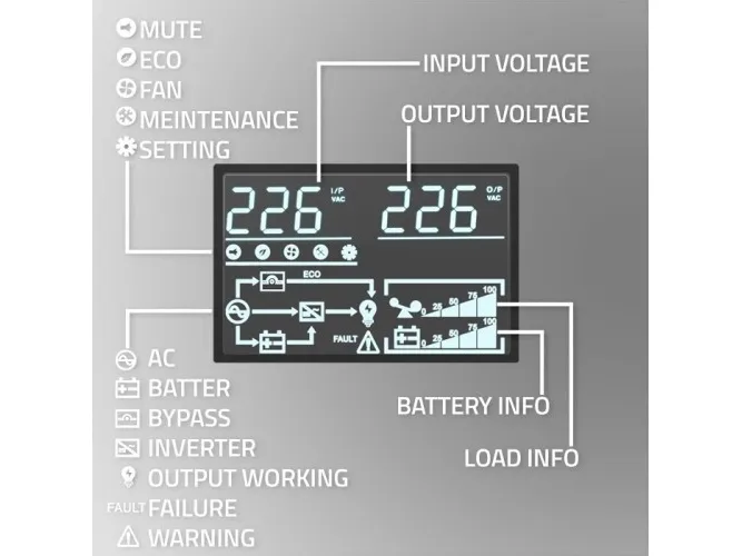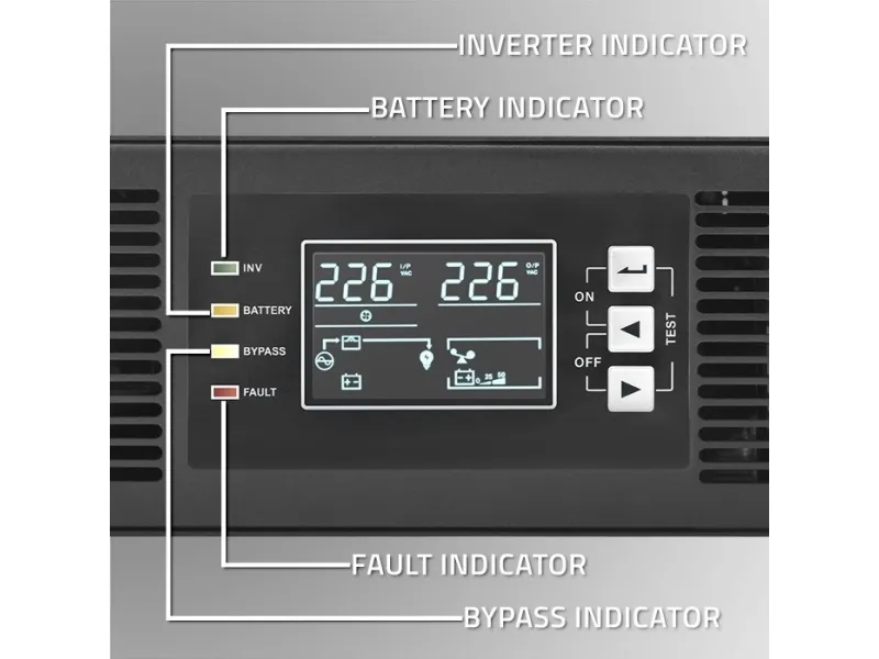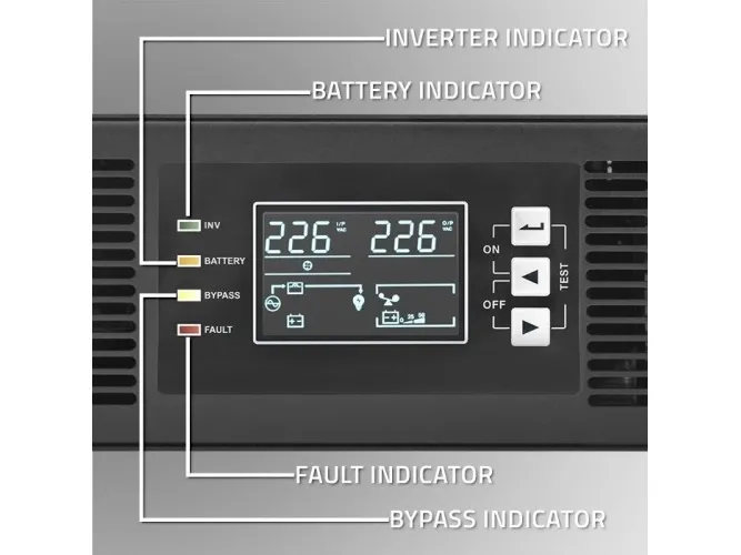 An online UPS has a voltage that is continuously recycled; in the event of an unexpected drop in mains voltage, the UPS maintains the operation of the connected device, thanks to the built-in batteries, which are continuously charged. Thus, mains power is only needed to charge the batteries. Permanently connected devices always receive clean energy, without interference from the battery, so the output voltage of the online UPS will always be constant, regardless of the input voltage. The back-up time of the equipment is from a few minutes to several minutes which allows data to be saved and the equipment to be switched off safely, minimising the risk of data loss and equipment damage.