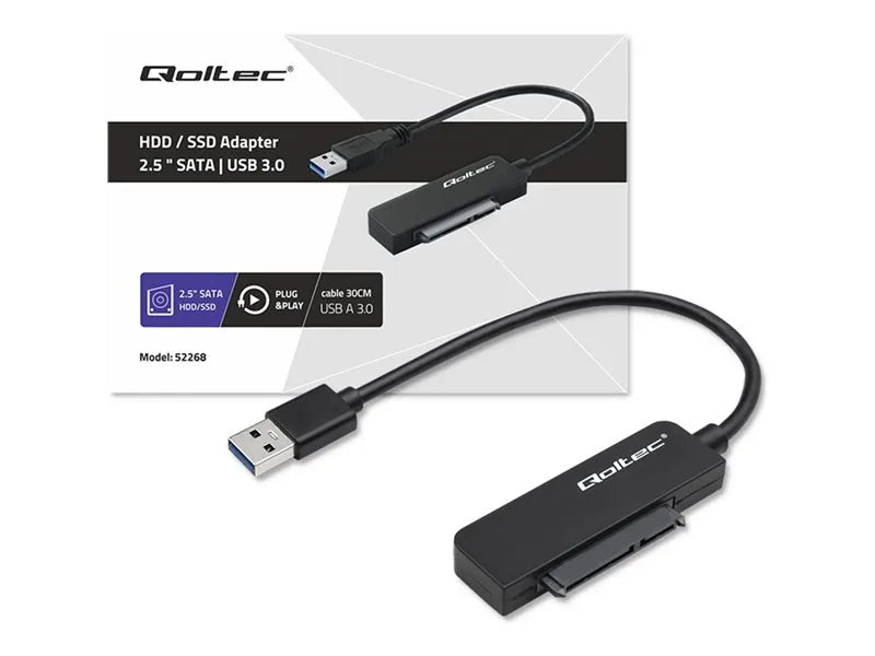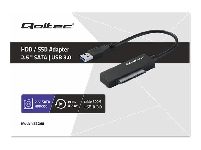 The SATA adapter from Qoltec is a reliable and practical device that allows you to quickly and conveniently connect a 2.5" HDD or SSD to your computer or laptop via a modern USB 3.0 connector. It allows you to clone hard drives, recover data and expand memory in an extremely easy and convenient way. Thanks to the Plug-and-Play technology used, the use of this adapter is extremely simple - you do not need to install any additional drivers.