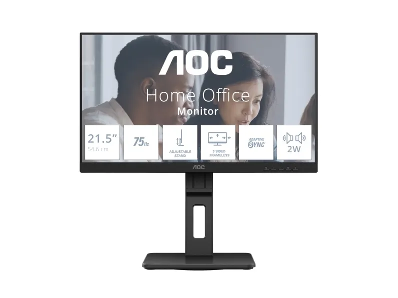 The 22E2UMF features a 21.5” monitor designed to revolutionize your workspace. With a height-adjustable stand ensuring ergonomic comfort, a three-sided frameless design for an immersive viewing experience, and powerful 2W speakers, this monitor combines style and functionality seamlessly. The integrated USB HUB facilitates easy connectivity for your peripherals, streamlining your workflow. It also prioritizes your well-being with the flicker-free technology, reducing eye strain during extended usage. Elevate your productivity with the 22E2UMF.AOC E2 22E2UMF. Display diagonal: 54.6 cm (21.5"), Display resolution: 1920 x 1080 pixels, HD type: Full HD, Display technology: LED, Response time: 4 ms, Native aspect ratio: 16:9, Viewing angle, horizontal: 178°, Viewing angle, vertical: 178°. Built-in speaker(s). Built-in USB hub, USB hub version: 3.2 Gen 1 (3.1 Gen 1). VESA mounting, Height adjustment. Product colour: Black