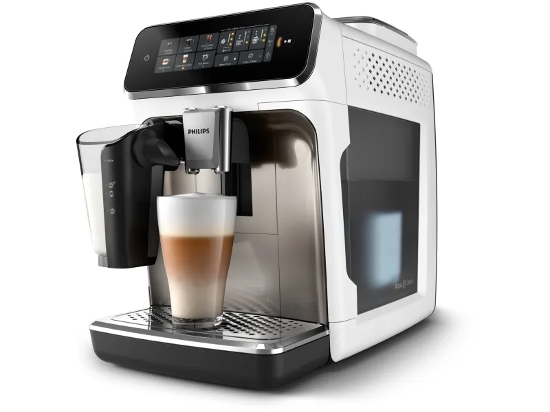 The Philips 3300 series EP3349 automatic coffee machine delivers a brewing experience, allowing users to enjoy a variety of coffee beverages including cappuccino, espresso, latte macchiato, and ice coffee. With an integrated coffee grinder featuring 12 settings, this machine provides the flexibility to brew with ground coffee or fresh coffee beans. The 1.8-liter removable water tank and 275 g coffee bean container ensure ample supply for multiple servings, while the 15 bar pressure supports rich flavor extraction.