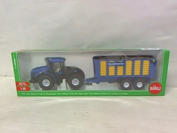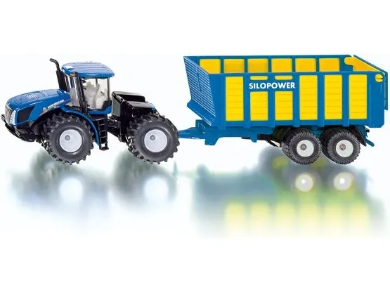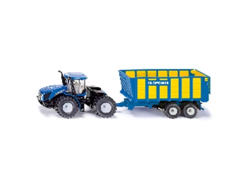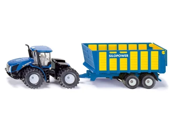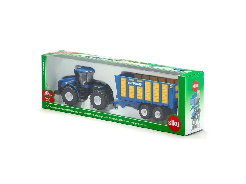 Detailed New Holland T tractor for playing and having fun. A wide range of features: True-to-original articulated joint, Silospace silage trailer with opening tailgate, Removable cabin, Treaded and rubberised tyres. Excellent addition to other items in the SIKU Farmer series. Scale: 1:50, Material: metal/plastic, Dimensions: 32.1 x 5.8 x 7.9 cm.