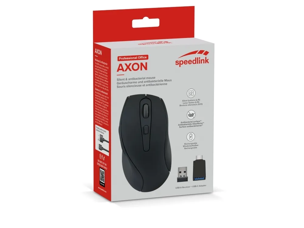 Speedlink AXON Hiljainen ja antibakteerinen ladattava hiiri - langaton, USB-A/-C, kumimusta, kumi-musta