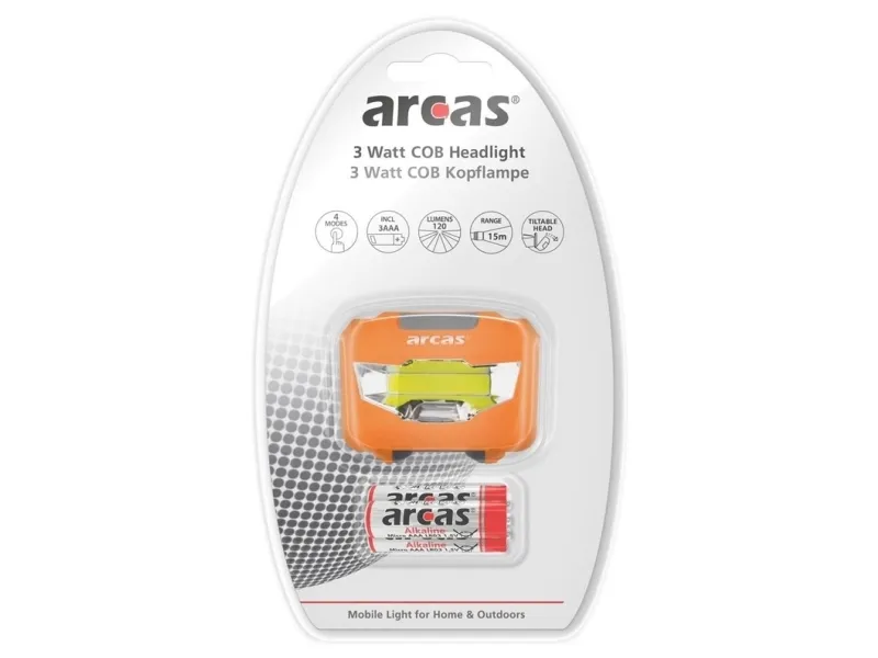 Product type- Headlamps. Brand- Arcas. Degree of protection (IP)- None. Batteries- AAA. Article- ARC_LUK_5542. Length- 3 cm. Width- 6 cm. Height- 4.2 cm. Lamp type- LED. Luminous flux- 120 - 120lm. Material housing- Plastic. Colour housing- White. Number of operating modes- 4. Batteries included- Yes. Number of batteries- 3. Mandatory warranty- 24 mo.