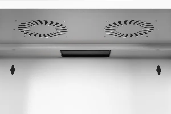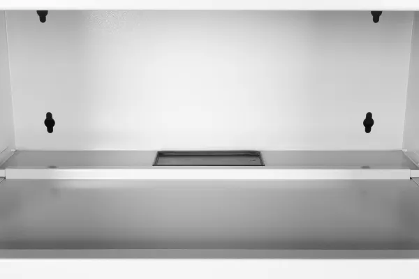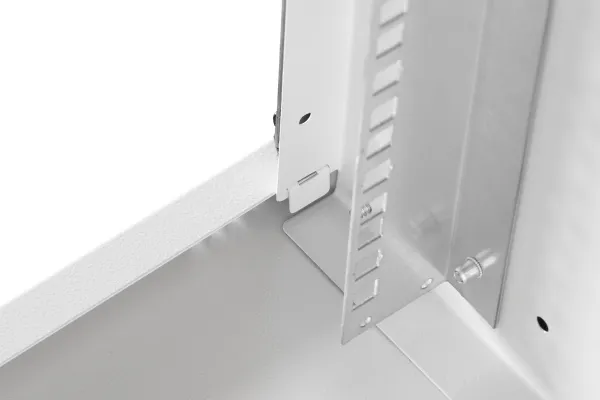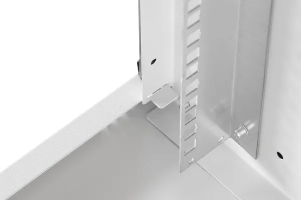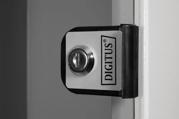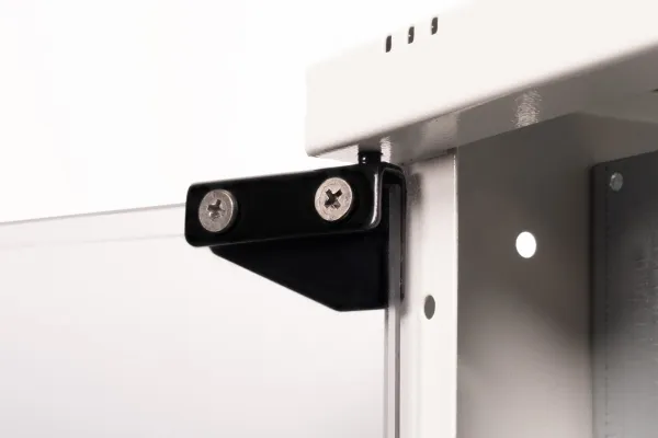 Lasinen ovi, galvanized rails, lukittava ovi, passiivinen tuuletus, kaapelintulopisteet ylhäällä ja alhaalla, cable entry with plastic cover, 200° door opening, säädeltävä kiskojen syvyys, 1,5 mm teräsarkki