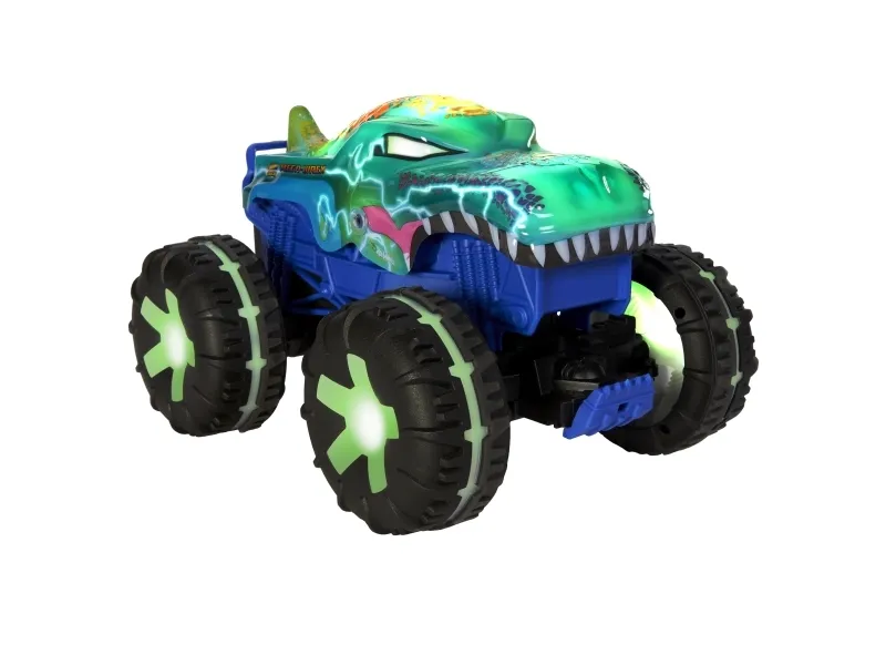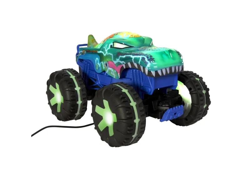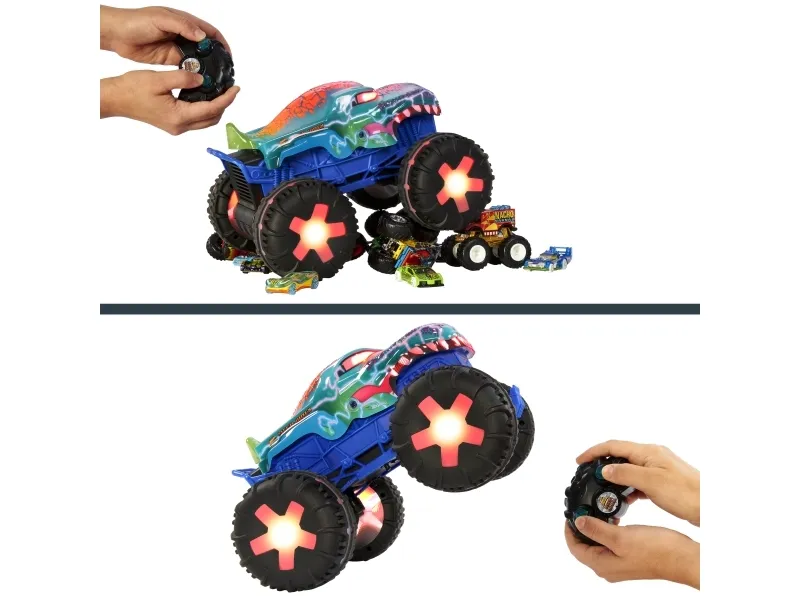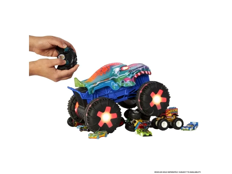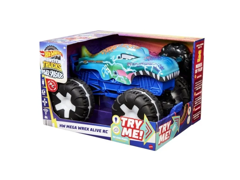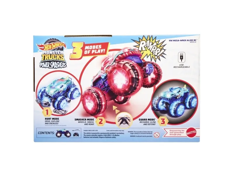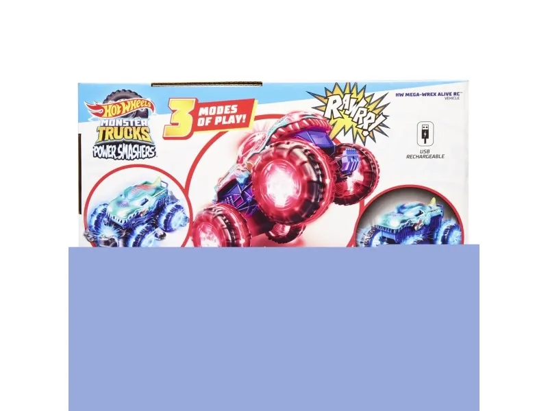 The legendary Hot Wheels Monster Trucks Mega-Wrex comes alive in 1:15 scale, featuring interactive lights and sounds and three modes of play! In Hunt Mode, Mega-Wrex powers up and stalks its prey every hit activates lights and sounds. It takes on challengers with a big roar in Smasher Mode, increasing its noises and ferociousness the more it smashes. In Guard Mode, Mega-Wrex recharges with a soft glow, ready to be awakened at any moment. Every interaction has accompanying lights and sounds to inspire dynamic play and imaginative storytelling. Colours and decorations may vary.Hot Wheels Monster Trucks 1:15 Scale Mega-Wrex Alive Remote-Control Vehicle, Battery-Powered RC with Interactive Lights & Sounds. Product type: Monster truck, Recommended age (min): 5 yr(s), Recommended age (max): 99 yr(s). Battery type: Built-in battery, Number of batteries supported: 1. Material: Plastic