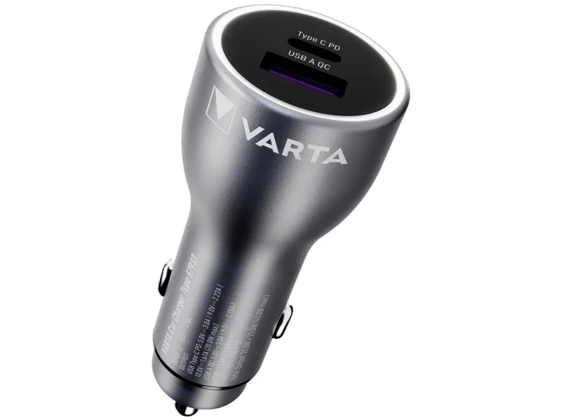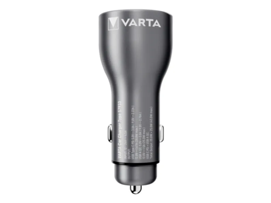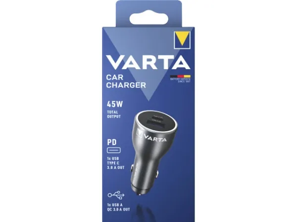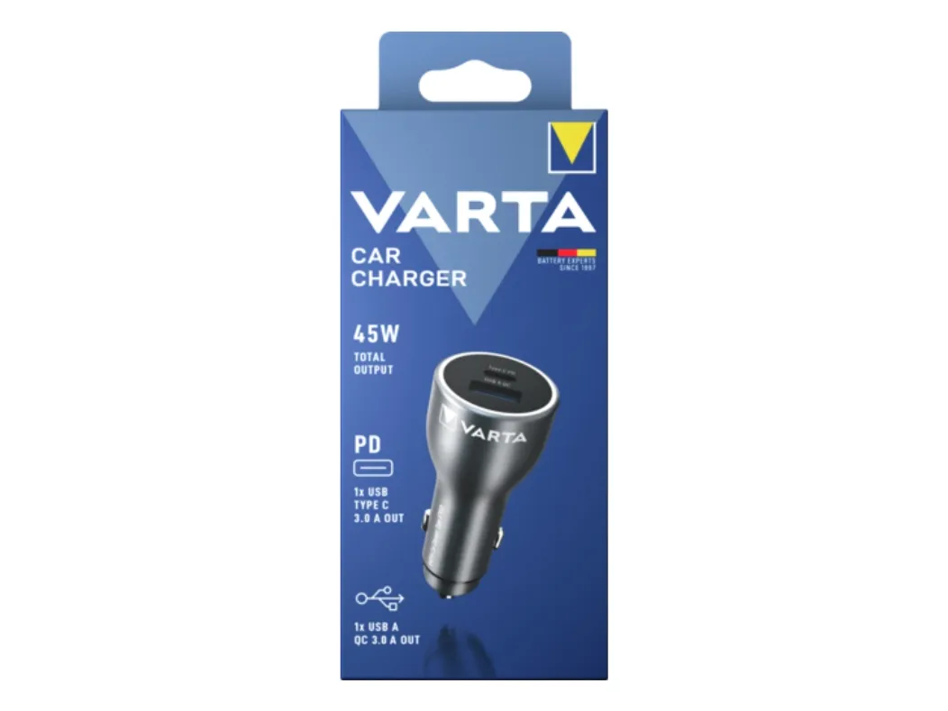 The Varta car power adapter is designed to keep your devices charged while on the go. With the capacity to provide 45 watts of power, this versatile adapter supports fast charging, with Power Delivery and Qualcomm Quick Charge technologies ensuring efficient energy transfer. Capable of charging up to two devices simultaneously, it features a 4-pin USB Type-A and a 24-pin USB-C output, making it compatible with a wide range of tablets, cellular phones, and headphones.