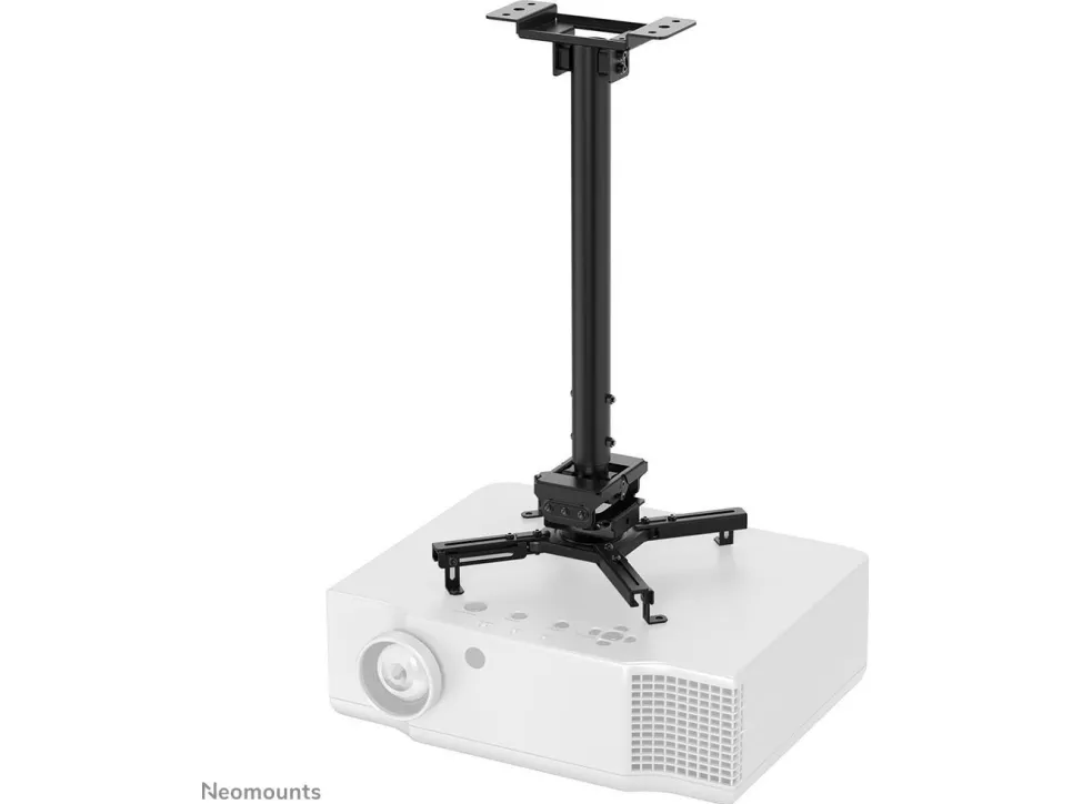 The Neomounts CL25-540BL1 is a universal projector ceiling mount. Because of the high weight capacity up to 35kg and the various adjustment options, this projector ceiling mount is widely applicable. The CL25-540BL1 has four extendable arms and the versatile tilt (+20°, -20°), rotate (360°) and swivel (+8°, -8°) technology, provides optimal placement of the projection on any canvas, screen or wall. The support is also adjustable in height from 60.5 to 90.5cm. The Neomounts CL25-540BL1 is equipped with an easy-release system, which highly eases installation; (de)installation of the projector to the projector mount can be done in an instant and by only one person. In addition, the round pole allows easy installation to a suspended ceiling. Finally, the pole of the Neomounts projector mount can be tilted on the ceiling side, so that installation against a sloped ceiling is effortless. The fixation of the mount itself is sturdy and firm, therefore vibration free. The cable management system of the CL25-540BL1 ensures the cables are neatly concealed, because they are routed through the pole of the projector ceiling mount.