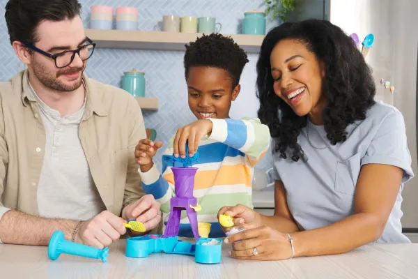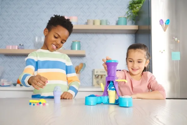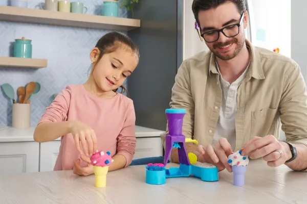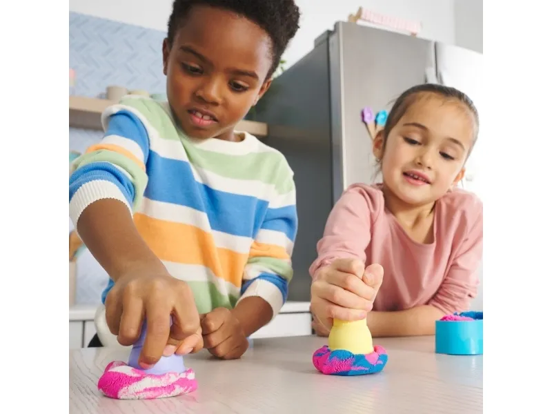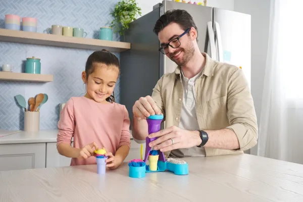 Swirl and create with the Kinetic Sand Soft Serve Station. For the first time, kids can swirl Kinetic Sand to mimic a soft-serve ice-cream experience like they’ve seen in the real world. With 396g of blue, pink and white Kinetic Sand, two ice-cream cones, and tools like a sprinkle grater and a scoop with sweet treat moulds, your child can serve up endless ice-cream possibilities. Scoop classic cones or create the ultimate swirl. Flow sand into the station, push down to swirl Kinetic Sand into the cone and remove to decorate. Add some sprinkles and extra toppings, then squish and create all over again. The One and Only Kinetic Sand is made from natural sand that sticks to itself for easy clean-up. It never dries out. Let it flow through your hands — it’s so satisfying, you won’t be able to put it down. Kinetic Sand is an exciting alternative to arts and crafts modelling clay and is a welcome addition to the craft table, sensory bin, kids’ activities time and Montessori toys. Kinetic Sand promotes fine motor skills and creativity through independent tactile play. Bring the ice-cream fun home with the Kinetic Sand Soft Serve Station.