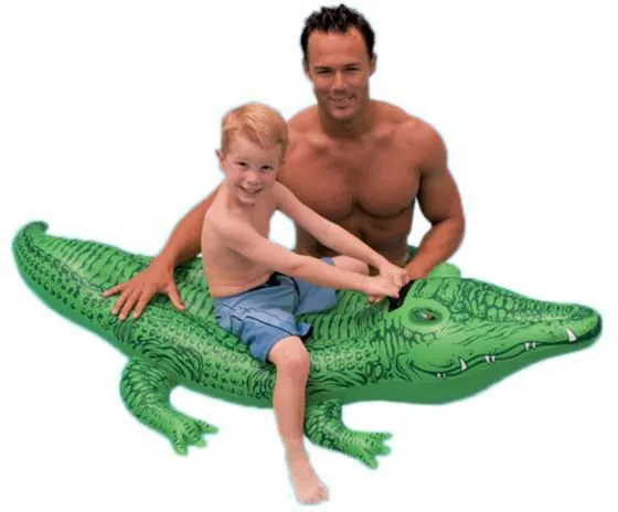Hold on to the handles when riding on this alligator. From 3 years. Stay calm, this alligator is not dangerous at all! The inflatable alligator has 2 heavy duty handles and measures 168 x 86 cm. Includes 1 repair patch. From 3 years - under adult supervision.