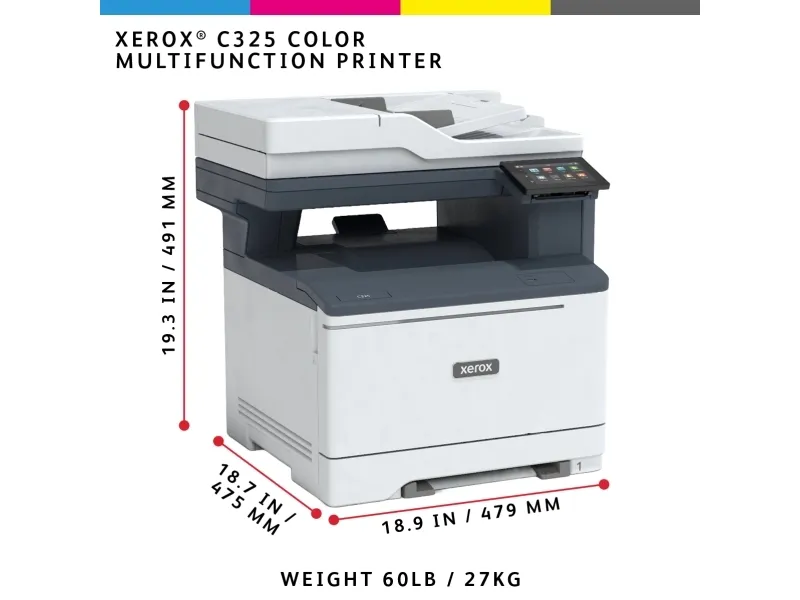 The Xerox C325V/DNI is a versatile and efficient office machine designed to meet the demands of modern workspaces. Offering high-quality printing, copying, scanning, and faxing functions, this device is engineered for efficiency and productivity. With advanced connectivity options, including Wi-Fi, Gigabit Ethernet, and support for various mobile printing services, it integrates seamlessly into any network, facilitating easy and flexible printing from anywhere. Security is a priority, with features like TLS 1.3 Encryption and WPA3 ensuring your documents and data remain protected. The Xerox C325V/DNI is capable of producing sharp, high-resolution prints at speeds of up to 33 pages per minute, making it a suitable choice for businesses that require fast and reliable document processing. Additionally, its intuitive 4.3" touchscreen display simplifies operation, allowing users to access functions quickly and efficiently. Whether you're printing reports, scanning contracts, or sending faxes, the Xerox C325V/DNI is designed to boost productivity and streamline your office workflow.