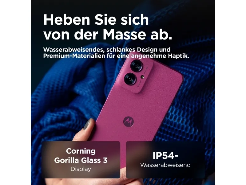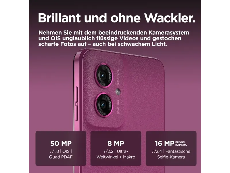 Introducing the phone with entertainment in its DNA. New moto g55 5G. Bring programmes, films and games to life on its immersive 6.49" FHD+ 120 Hz display.(1) Hear sound from every direction with stereo speakers and Dolby Atmos®.(2) Capture incredibly clear photos and smoother videos with a 50 MP camera system featuring optical image stabilisation (OIS).(3) And stand out with an eye-catching design, including options in soft vegan leather. With moto g55 5G, you can binge watch non-stop thanks to a long-lasting battery and speedy charging. Hold more of your favourites with tons of built-in storage. And unleash entertainment at 5G speed with a powerful octa-core processor. moto g55 5G takes entertainment to a whole new level.Motorola moto g55 5G. Display diagonal: 16.5 cm (6.49"), Display resolution: 2400 x 1080 pixels. Processor frequency: 2.5 GHz, Processor family: MediaTek Dimensity, Processor model: 7025. RAM capacity: 8 GB, Internal storage capacity: 256 GB. Rear camera resolution (numeric): 50 MP, Rear camera type: Dual camera. SIM card capability: Dual SIM. Operating system installed: Android 14. Battery capacity: 5000 mAh. Product colour: Purple. Weight: 182 g