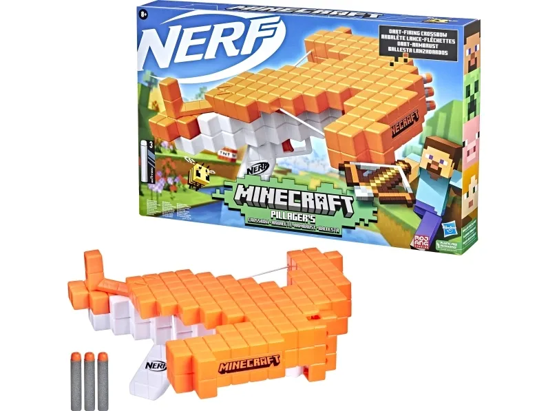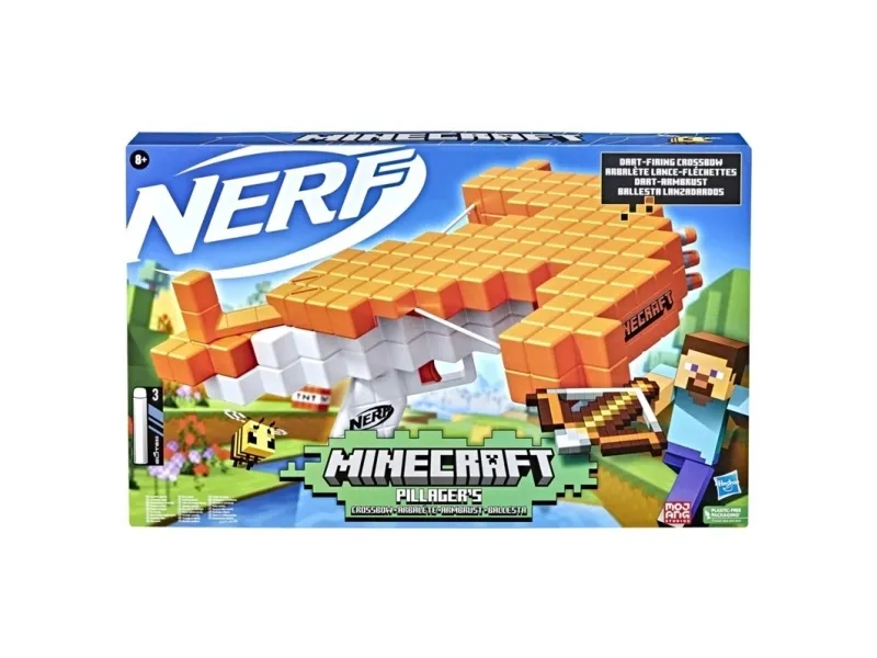 Nerf ja Minecraft yhdistivät voimansa! Tuloksena syntyi ainutlaatuisia blastereita Nerf-seikkailuihisi. Nerf Minecraft Pillager's Crossbow perustuu suosittuun Minecraft-peliin. Napsi kohteita oikean varsijousen tapaan toimivalla nuolia ampuvalla varsijousella. Vedä varsijousen jänne taakse viritysvipua vetämällä ja laukaise 1 nuoli painamalla painiketta. Varsijousessa on 3 edestä ladattavaa piippua, joten voit laukaista 3 nuolta peräkkäin. Nerf Minecraft ‑varsijousi sisältää 3 virallista Nerf Elite ‑vaahtomuovinuolta, joiden suorituskyky ja laatu on testattu. Nuolet sopivat loistavasti Nerf-peleihin sekä ulkona että sisätiloissa. Silmäsuojainten käyttöä suositellaan (eivät sisälly pakkaukseen). Copyright 2022 Mojang AB. TM Microsoft Corporation. Hasbro ja kaikki siihen liittyvät termit ovat Hasbron tavaramerkkejä.