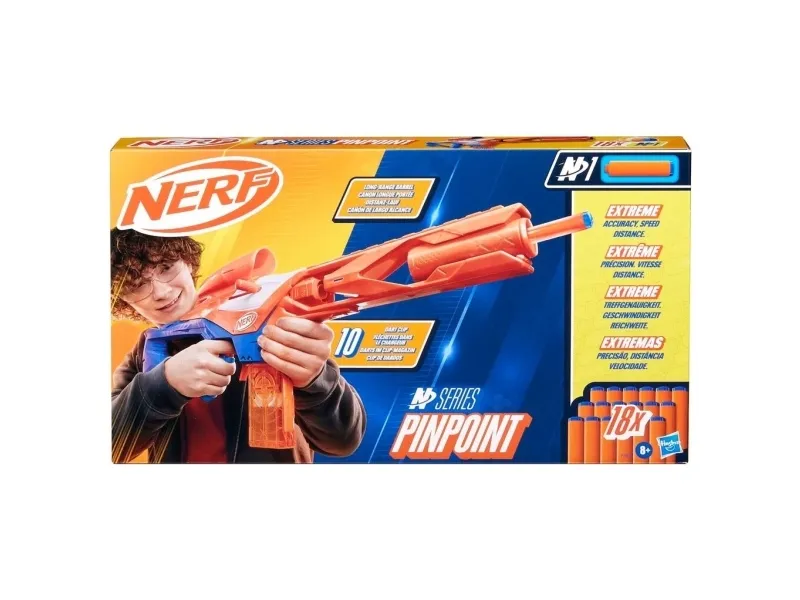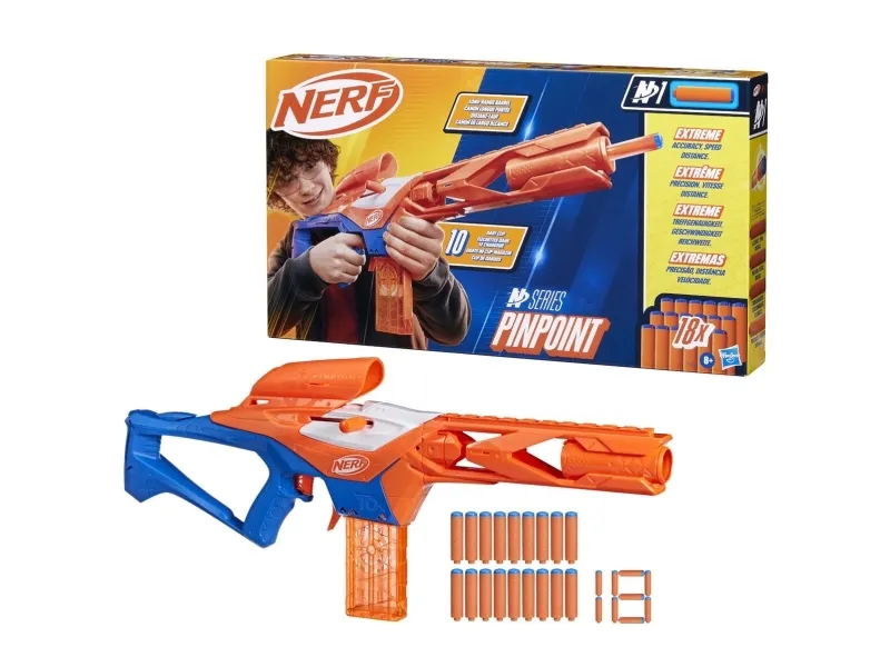 The Nerf brand levels up your game with high-performance Nerf N Series dart blasters and Nerf N1 darts! You have the skills as a Nerf battler, now you have the blaster and darts to gain a superior edge in indoor and outdoor play. From the creators of the foam dart, the Nerf brand unleashes the next evolution in foam dart blasting with Nerf N Series N1 darts, delivering EXTREME ACCURACY, SPEED, and DISTANCE! The Nerf N Series Pinpoint dart blaster is built for accuracy with cool styling and features that give you a targeting advantage in Nerf backyard games. The bolt-action blaster has a 10-dart clip and includes 18 Nerf N1 foam darts, giving you enough darts to fully load the clip and additional darts for reloads. To play, load darts into the clip, load the clip into the blaster, move the priming bolt backward and forward, and pull the trigger to fire a dart. Nerf N Series blasters are compatible only with Nerf N1 darts. Eyewear recommended (not included).NERF and HASBRO and all related trademarks and logos are trademarks of Hasbro, Inc.