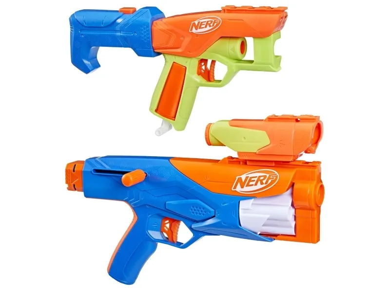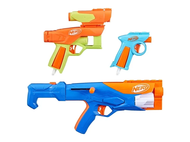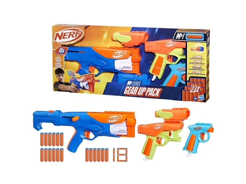 The Nerf brand levels up your game with high-performance Nerf N Series dart blasters and Nerf N1 darts! You have the skills as a Nerf battler, now you have the blaster and darts to gain a superior edge in indoor and outdoor play. From the creators of the foam dart, the Nerf brand unleashes the next evolution in foam dart blasting with Nerf N Series N1 darts, delivering EXTREME ACCURACY, SPEED, and DISTANCE! The Nerf N Series Gear Up Pack includes 3 different blasters and 2 Nerf accessories to create 10 different blaster styles. Build your Nerf stockpile and be ready for whatever the game brings with this set that includes 18 Nerf N1 foam darts. The Flex blaster and Dealer blaster are single-fire blasters with pull-down priming. The bolt action Wielder blaster fires 4 darts in a row. The stock attaches to 2 of the blasters. The scope attaches to all 3 blasters. Nerf N Series blasters are compatible only with Nerf N Series N1 darts. Eyewear recommended (not included).NERF and HASBRO and all related trademarks and logos are trademarks of Hasbro, Inc.