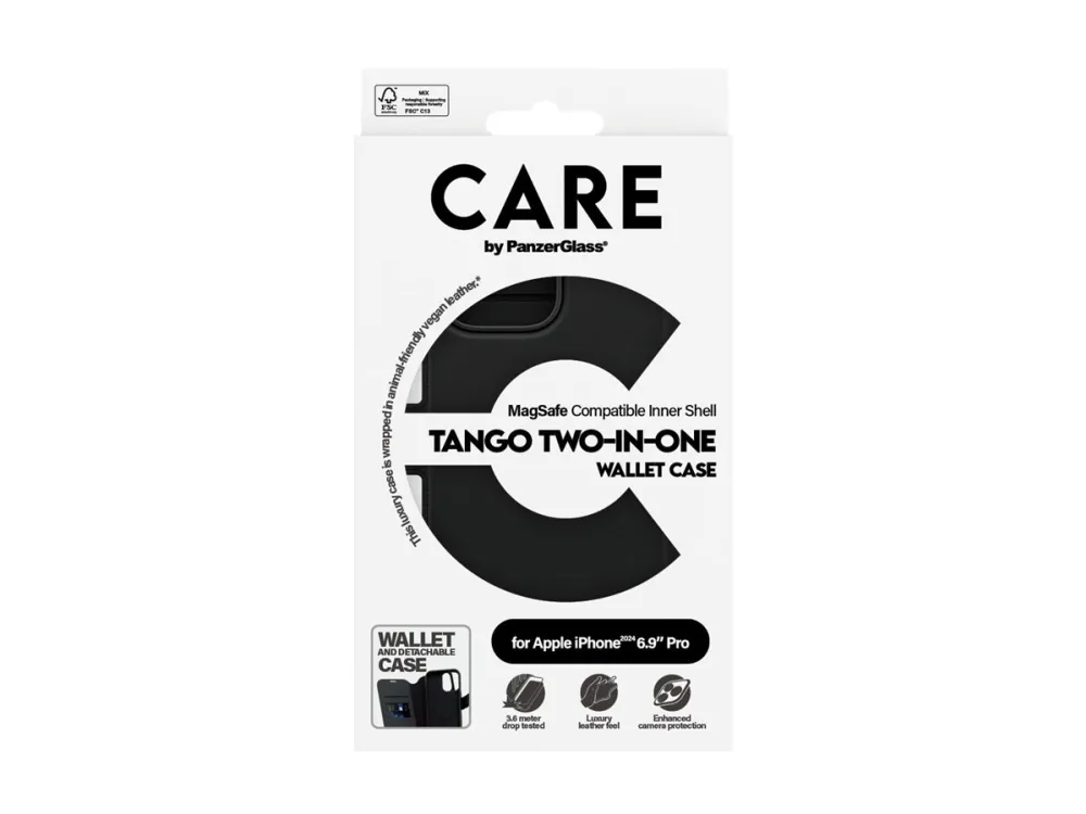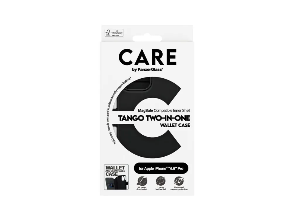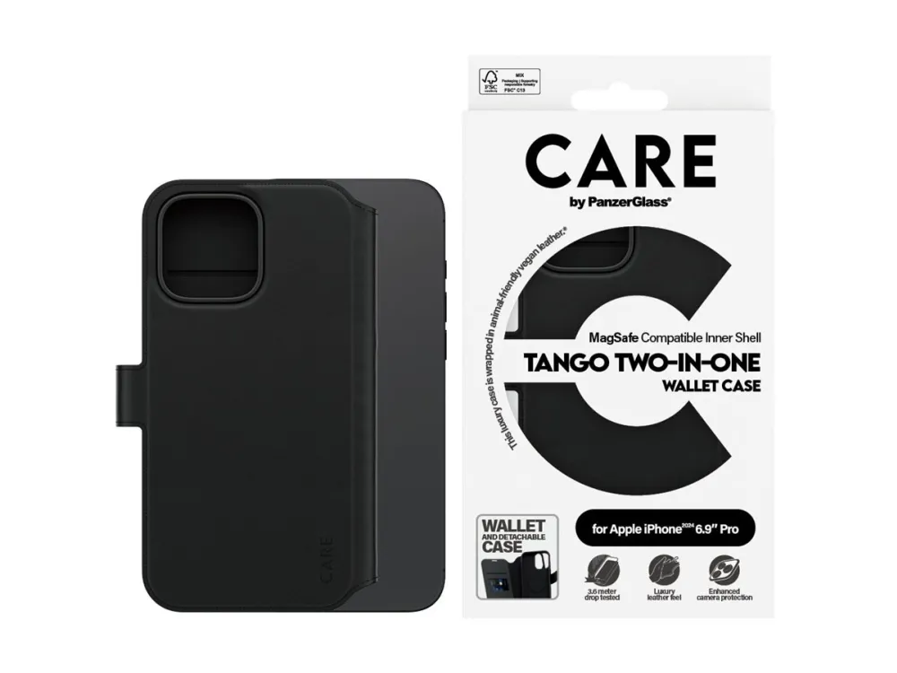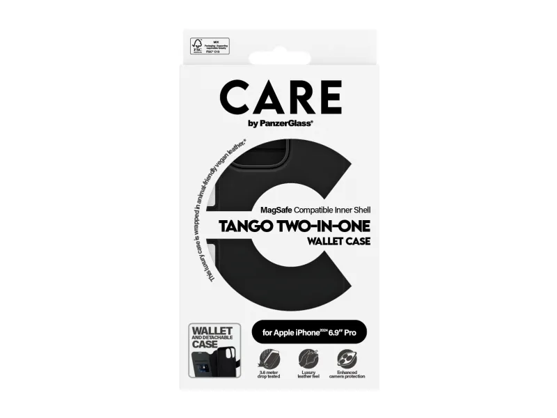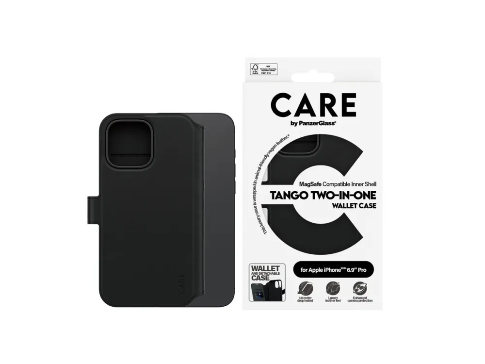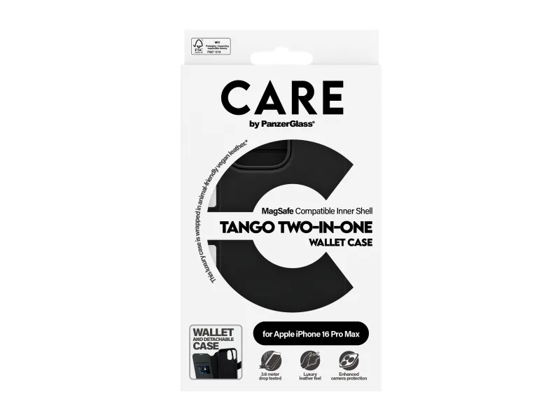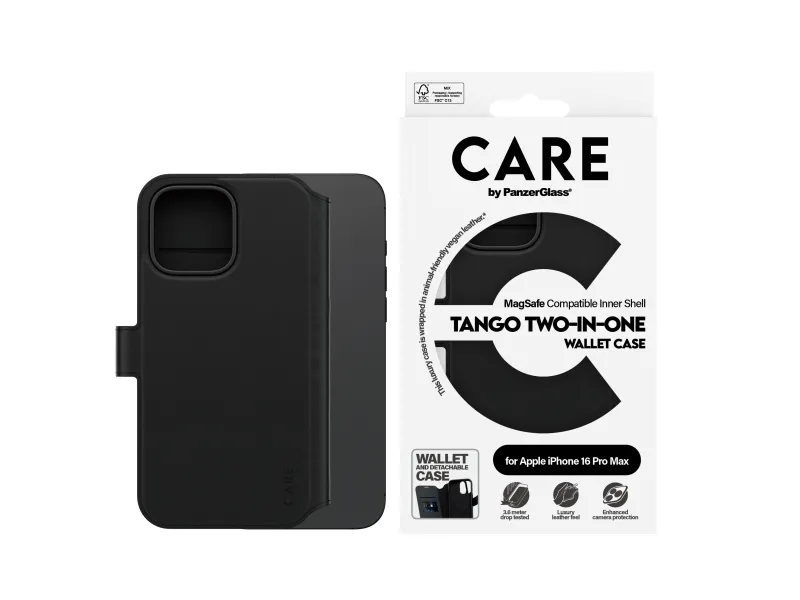 DARE TO CARE CARE is a playful and protective international tech and lifestyle brand featuring a range of products created using the highest quality materials and influenced by fashion, art, and music. We care about people and the world we live in. We care about sustainability and self-expression. And we care about tech and extending its lifetime. So protect your tech in style and show the world you CARE.PanzerGlass CARE™ by ® Tango 2-in-1 Wallet Case w. MagSafe iPhone 16 Pro Max. Case type: Cover, Brand compatibility: Apple, Compatibility: Apple - iPhone 16 Pro Max, Product colour: Black