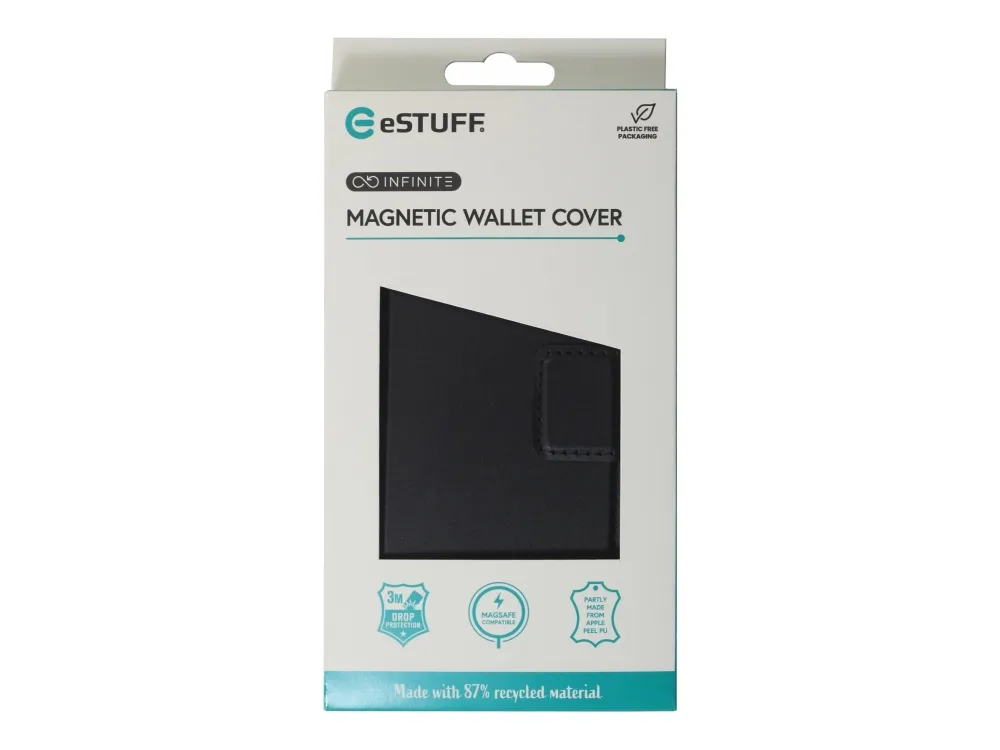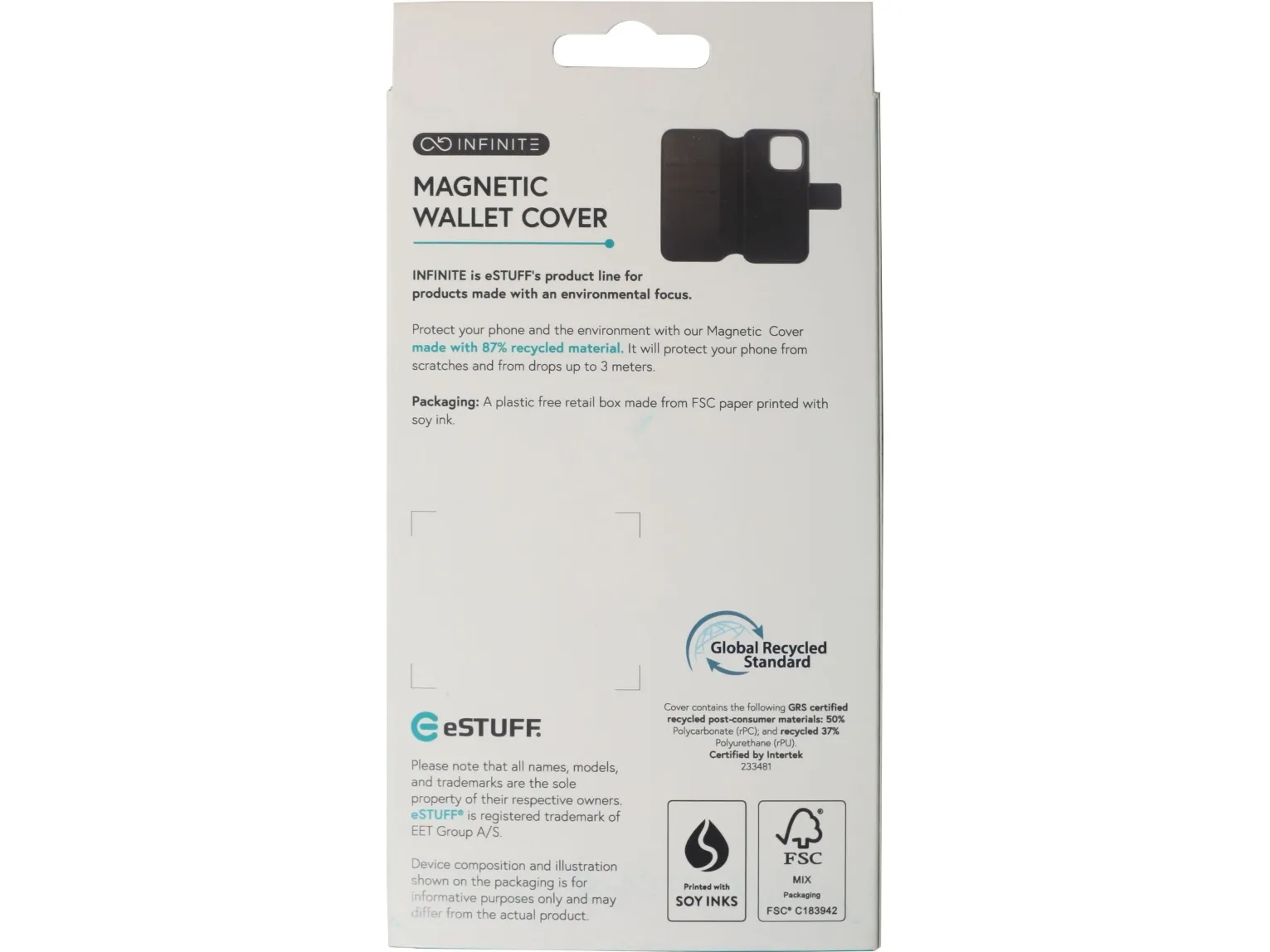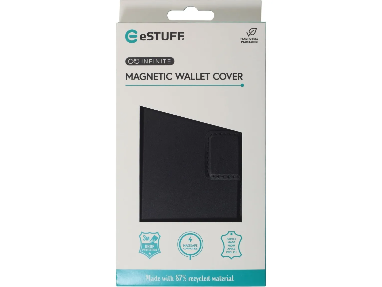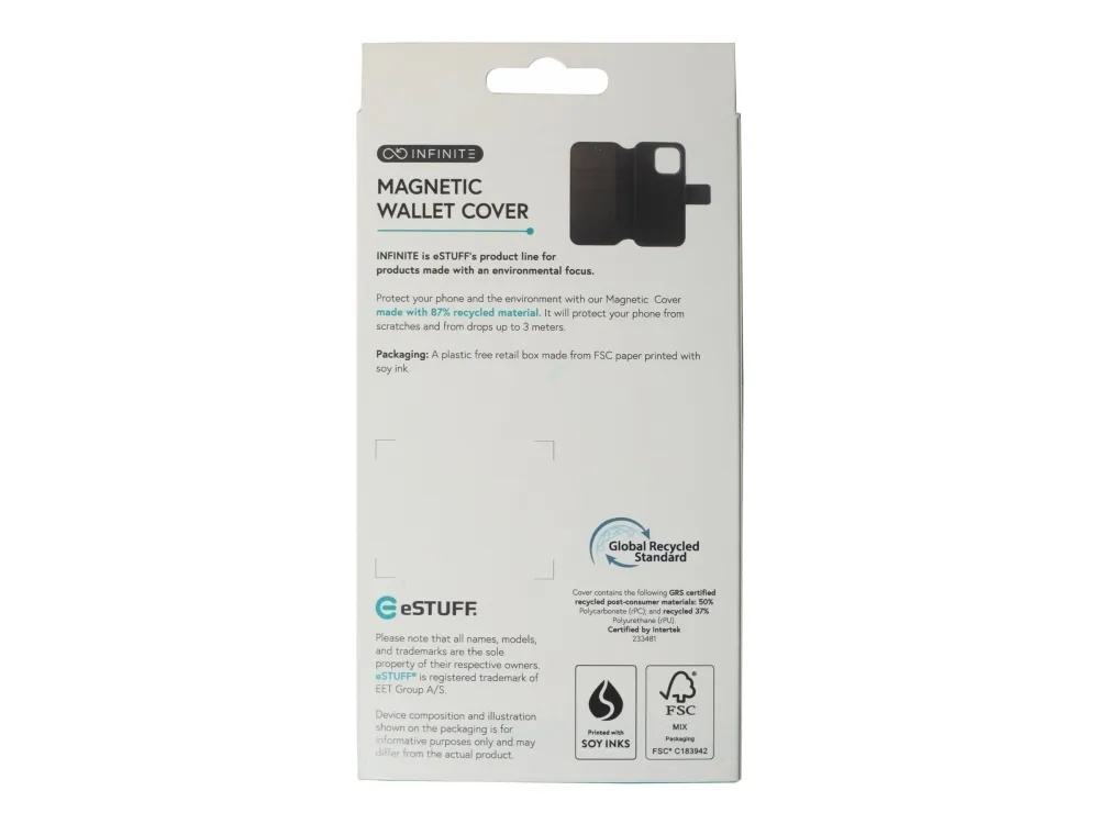 The eSTUFF Infinite Milan carrying case offers a blend of functionality and sustainability for cell phone users. Made from 87% recycled materials, including recycled silicone and polycarbonate, this protective cover protects your device from scratches and bumps while supporting eco-friendly practices. With a stylish flip cover design, the case features three card slots for added convenience, allowing users to carry essentials without the bulk of a traditional wallet. The built-in magnets and magnetic closure ensure that your phone remains secure while providing easy access.