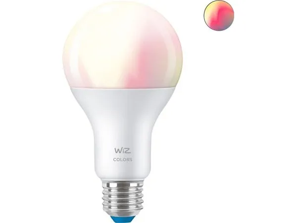 The WiZ LED A67 full color bulb brings smart lighting for your daily living. Retrofit into any lamp shade to create the ambience of your choice with 16 million colors as well as warm to cool white light. You can set schedule to turn lights on and off according to daily or weekly routines, control with your smartphone or your voice and have remote access to your lights even when you're away. WiZ lights connect to your existing Wi-Fi, no additional hardware is needed.WiZ Bulb 100W A67 E27. Type: Smart bulb, Interface: Wi-Fi, Product colour: White. Energy efficiency class: E, Input voltage: 220-240 V, AC input frequency: 50 - 60 Hz. Width: 77 mm, Depth: 142 mm, Height: 142 mm. Package width: 8.5 mm, Package depth: 8.5 mm, Package height: 18.5 mm. Quantity per pack: 1 pc(s)