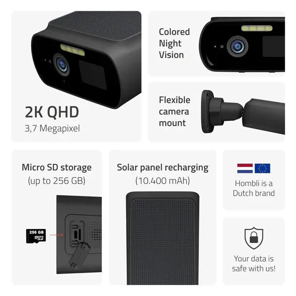 IP66-suojaus, -20–50 °C lämpötila-alue ja edistynyt aurinkolataus tekevät Hombli Solar Cam 2K -kamerasta täydellisen ulkokäyttöön. Se kestää rankkasateet ja kovan sään, ja aurinkopaneeli on suunniteltu maksimoimaan energian keruu ja hylkimään likaa ja vettä.