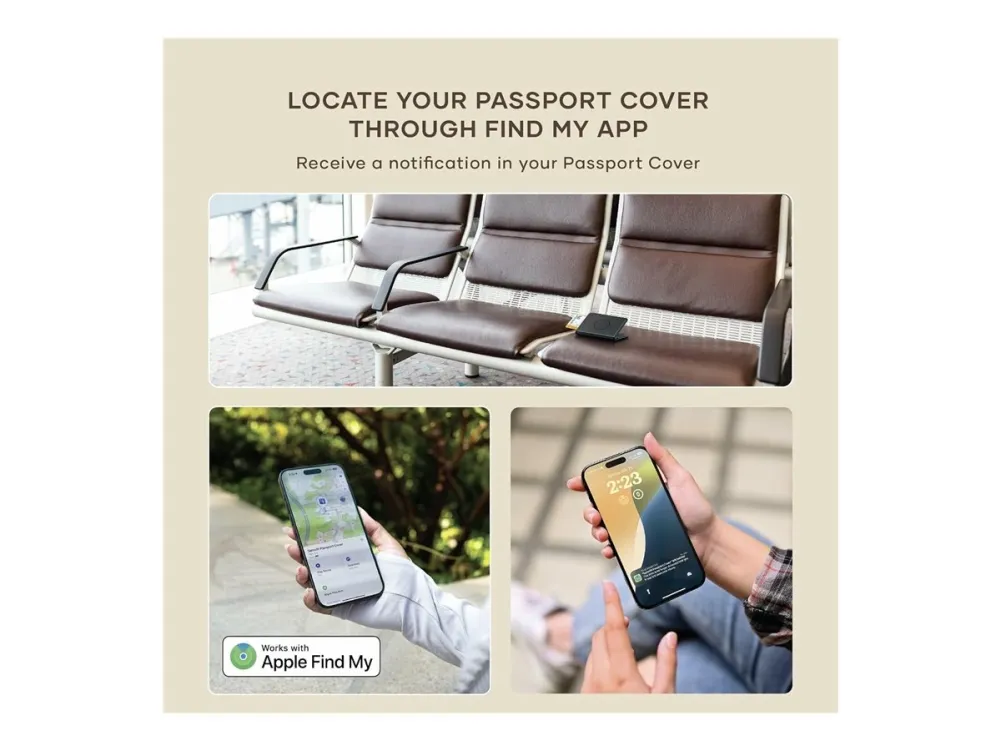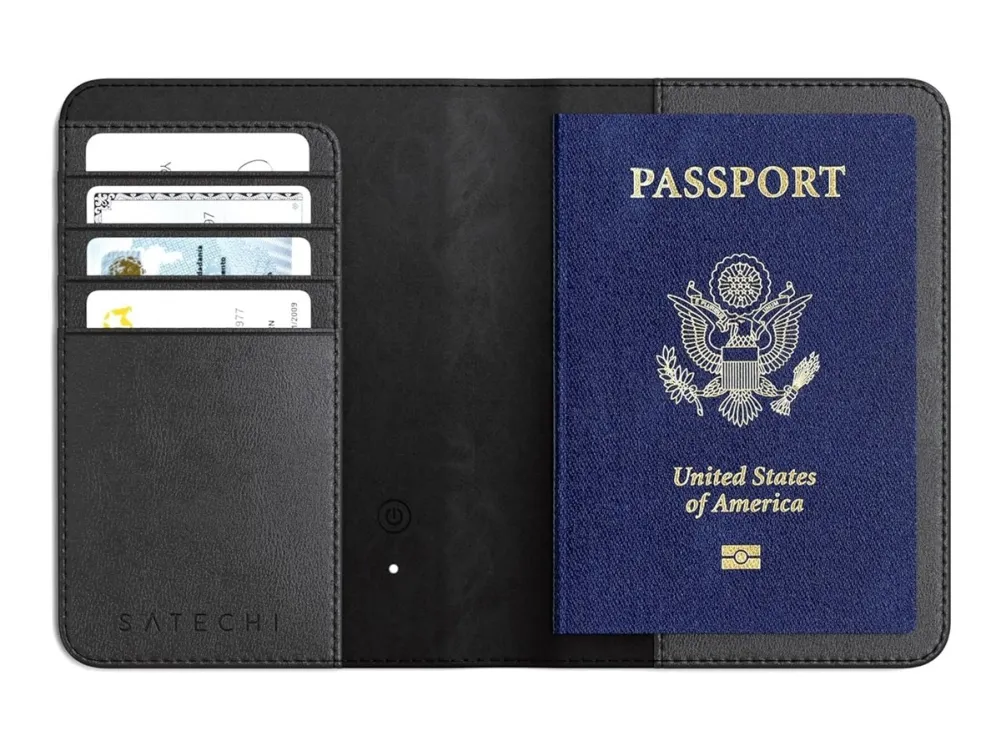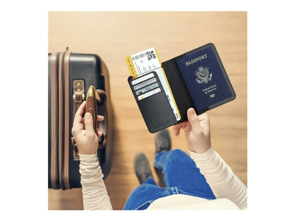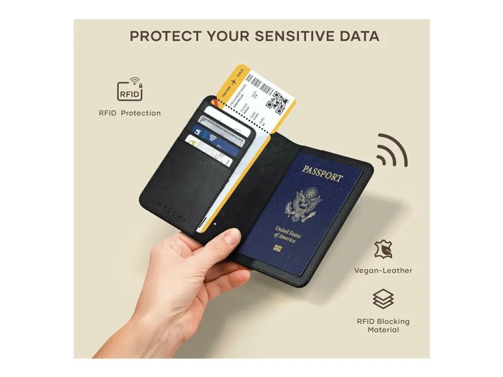 Travel smart and stay organized with the Satechi Vegan-Leather Passport Cover with Find My Tracker in black. Combining style functionality and the latest in Apple's tracking technology this passport cover ensures you never misplace your travel documents again. Crafted with premium vegan leather Integrated Find My Tracker RFID blocking for added security Multiple compartments for organization Sleek stylish black design Crafted with premium vegan leather The Satechi Passport Cover is made from high-quality vegan leather offering durability and a sleek sophisticated look. This eco-friendly material ensures you travel in style while remaining cruelty-free. Integrated Find My Tracker Never worry about losing your passport again. The integrated Apple Find My Tracker allows you to locate your passport cover using your iPhone quickly. This innovative feature provides peace of mind knowing your important documents are always within reach. RFID blocking for added security Protect your personal information with the built-in RFID-blocking technology. This feature safeguards your passport and credit cards from electronic theft ensuring your sensitive data remains secure while you're on the move. Multiple compartments for organization Stay organized with multiple compartments to hold your passport boarding passes credit cards and other travel essentials. The thoughtfully designed layout helps you keep everything in one place making your travel experience smoother and more efficient. Sleek stylish black design Designed with a minimalist sleek aesthetic the black Satechi Vegan-Leather Passport Cover complements any travel outfit. Its timeless design ensures that you travel in style no matter your destination. Package includes 1x Satechi Vegan-Leather Passport Cover with Find My Tracker - Black 1x User Manual Product specifications Material: Premium vegan leather Colour: Black Dimensions: 143 x 106 x 17 mm Weight: 107.1 grams Built-in Apple Find My tracker RFID blocking technology Charging - Compatible with Qi Qi2 or MagSafe wireless chargers. Find My - Works with Apple's ?Find My? app. An iOS or iPadOS device must add the passport cover to the ?Find My? application. *An iOS iPadOS and macOS device can be used for tracking.