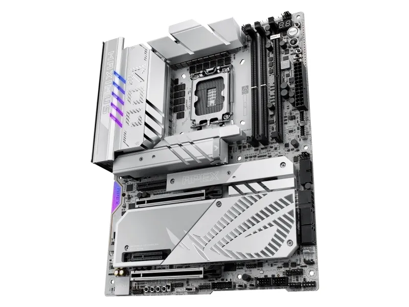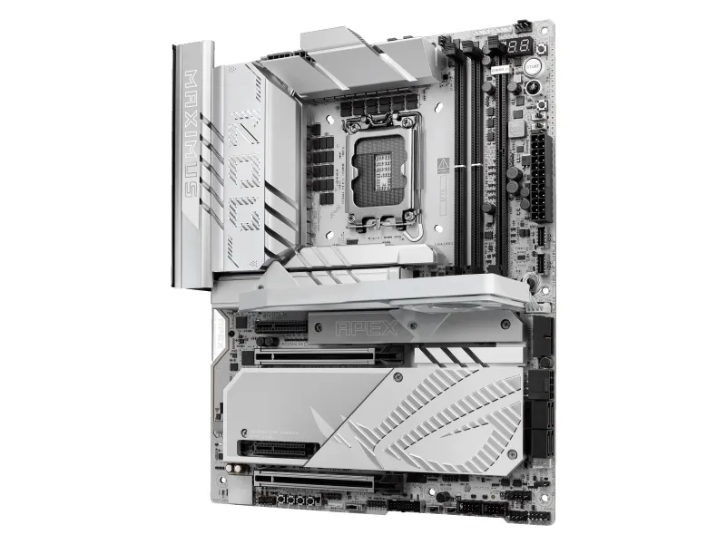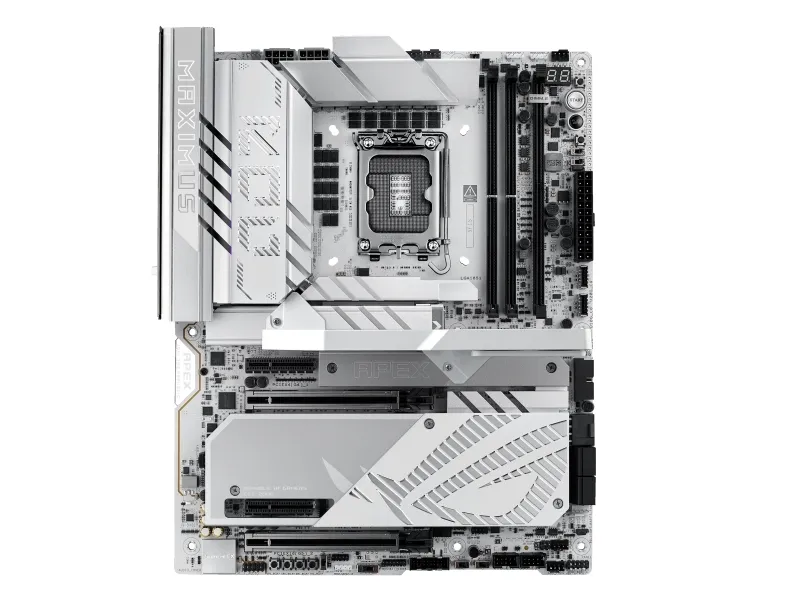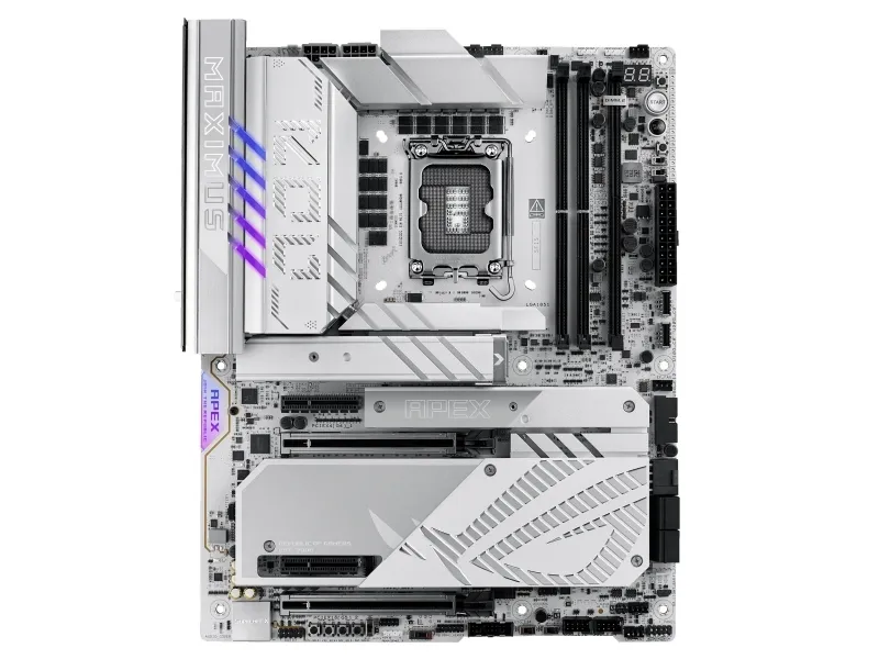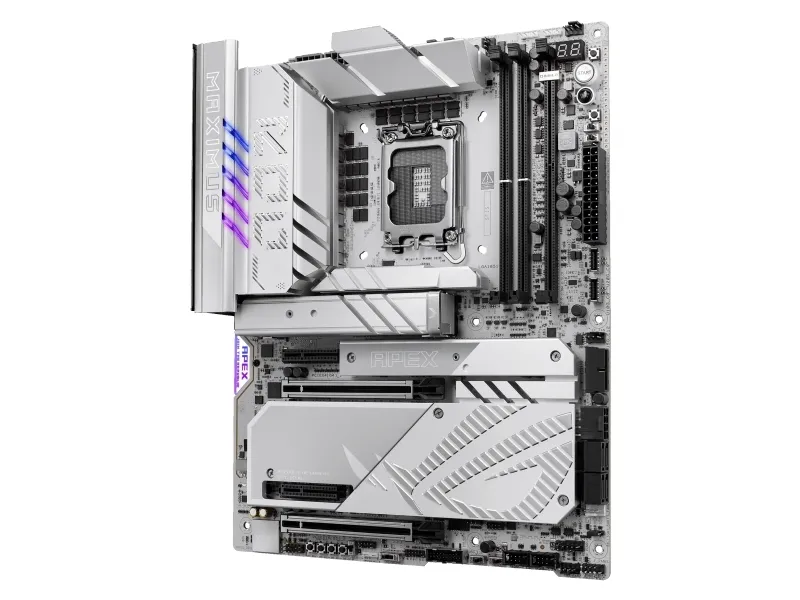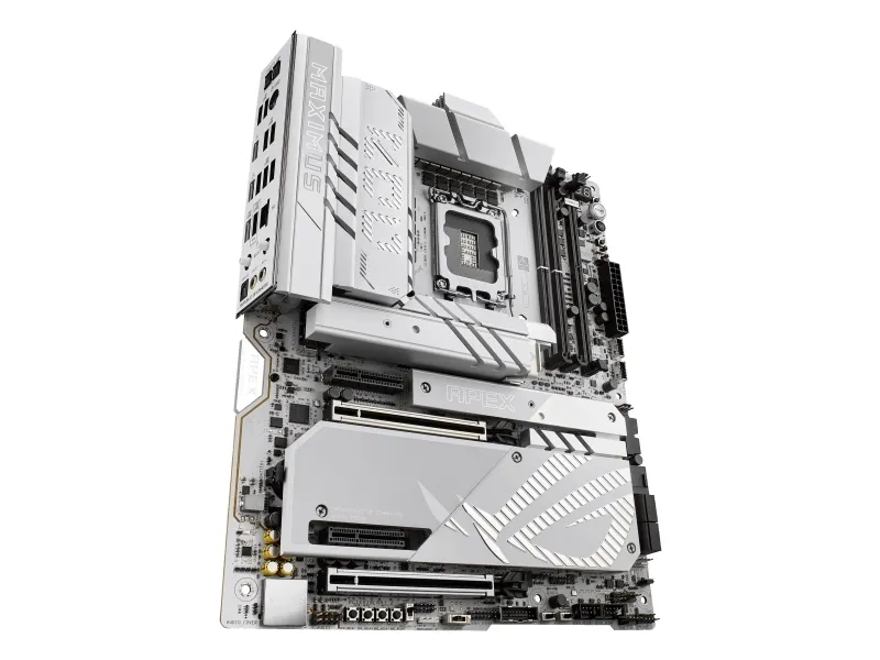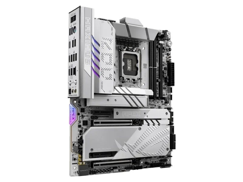 ROG Maximus Z890 APEX The ROG Maximus Z890 Apex fully supports Intel® Core™ Ultra processors (Series 2). Precision-engineered for supreme overclocking, it carries the legacy of the series forward into a new generation. With exceptional power delivery and a two-slot DDR5 memory layout, overclockers can meet and exceed their ambitions for record-breaking CPU and memory performance. For those who favor lighter colors for the aesthetics of their build, the ROG Maximus Z890 Apex features a cobble-gray surface, polished metallic accents, sleek contours and a predominantly silver palette.ASUS ROG MAXIMUS Z890 APEX. Processor manufacturer: Intel, Processor socket: LGA 1851 (Socket V1), Compatible processor series: Intel Core Ultra (Series 2). Supported memory types: DDR5-SDRAM, Maximum internal memory: 96 GB, Memory slots type: DIMM. Supported storage drive interfaces: M.2, SATA III, Supported storage drive types: HDD & SSD, RAID levels: 0, 1, 5, 10. Ethernet interface type: 5 Gigabit Ethernet, Top Wi-Fi standard: Wi-Fi 7 (802.11be), Wi-Fi standards: Wi-Fi 7 (802.11be). Component for: PC, Motherboard form factor: ATX, Motherboard chipset family: Intel