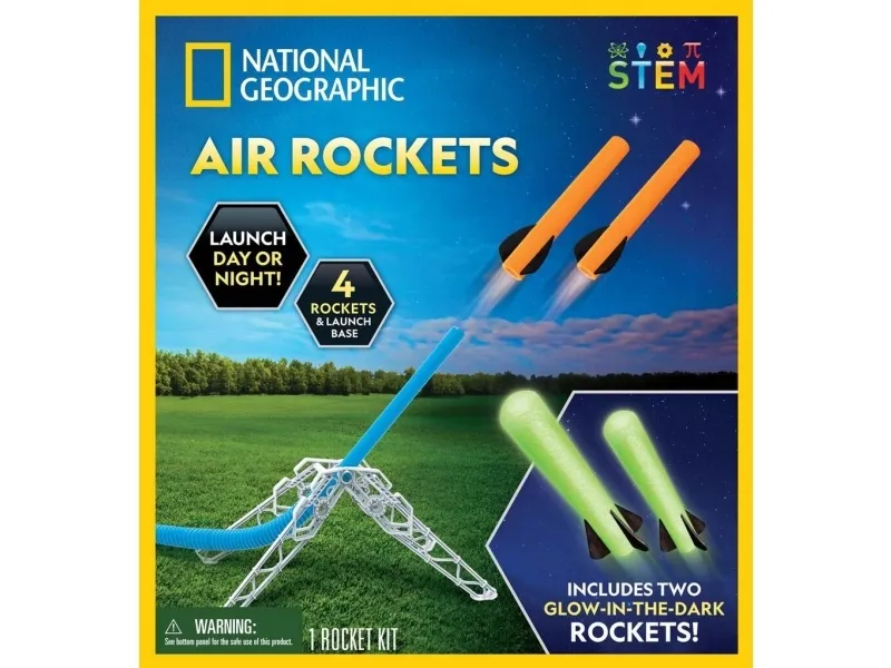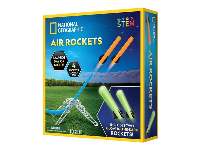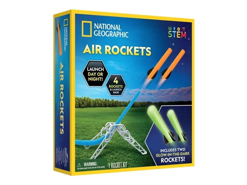 Send air-powered rockets soaring up to 100 feet with National Geographic Air Rockets! This is a great activity kit for kids that promotes physical play while teaching science in a totally fun way. Set-up is quick and easy, too. Simply install the launch base legs, mount the rocket, and then stomp the foot pump to send rockets into the sky! There are two vibrant orange rockets and two glow-in-the-dark rockets in the kit, making this set great to use day or night! The launch tube is adjustable so kids can experiment with flight paths and trajectories, and a detailed learning guide provides insight into the science of flight!