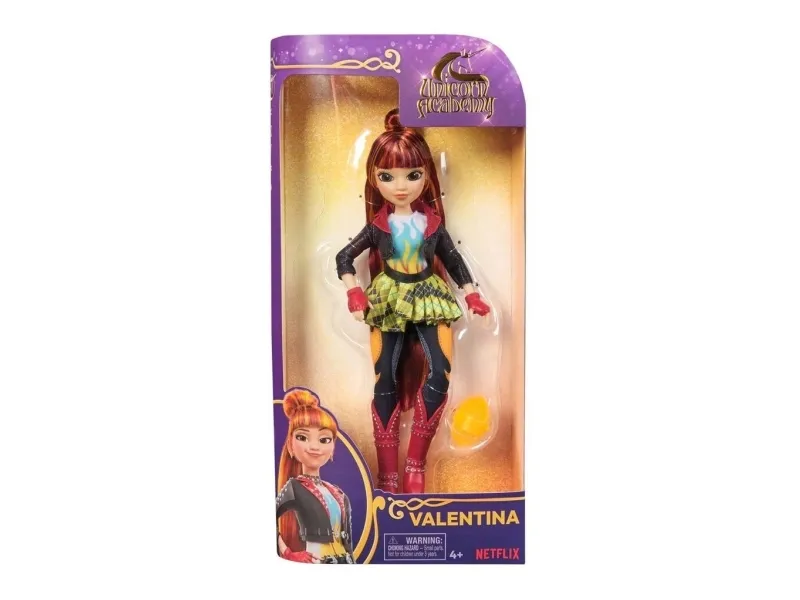 Create enchanting Unicorn Academy adventures at home with the Sophia, Ava, Isabel, Layla and Valentina fashion dolls. Inspired by the NETFLIX animated show and best-selling book series where friendship reins, these 9.5-inch dolls for girls bring the characters to life. Beautifully detailed from head to toe, Valentina’s fiesty personality comes through in her brushable red, orange and yellow highlighted hair (styling accessory included) and her signature unicorn rider outfit: black riding jacket, plaid skirt, riding pants with Fire Magic markings, studded red boots, and riding gloves doll accessories. With 9 points of articulation, pose Valentina as you protect Unicorn Island and its magic, and ride into adventure with her unicorn, Cinder (sold separately). The magical bonds between Unicorn Academy students and their unicorns will spark endless imaginative storytelling. For more ways to experience Unicorn Academy with your favorite characters, look for all of the rider dolls and their unicorns (each sold separately) and expand your world. For kids who enjoy unicorns and horse toys, dolls & accessories, doll house play, collectibles, plush toys and more, Unicorn Academy toys are fun birthday gifts for girls or gifts for any occasion. Bring home the magic of Unicorn Academy with the Valentina doll.