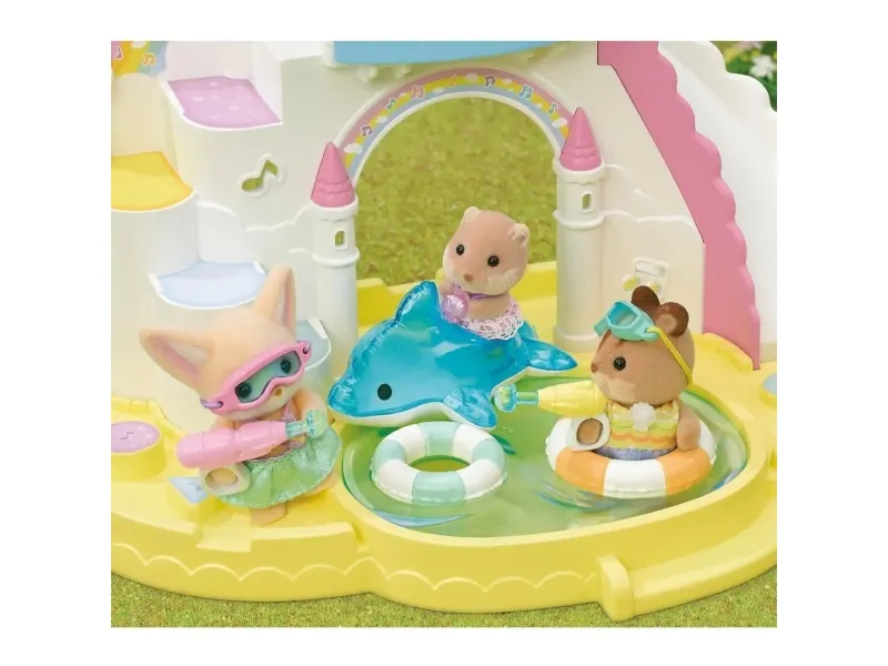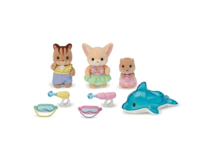 Kolmoset altaalla - setissä on 3 vauvaa: aavikkokettuvauva Yulie, pähkinäoravavauva Ambrose ja saukkovauva Nicola sekä tarvikkeet allasleikkeihin. Ilmatäytteinen delfiini on hauska: vauvat voivat ratsastaa sillä! Vauvoilla on yllään söpöt uimapuvut, joissa on aaltokuvioita ja simpukkanapit. Vauvat voivat pitää kädessään uimaleluja ja käyttää uimalaseja. Yhdistä muihin Sylvanian leluihin. Sopii 3+-vuotiaille. 3 vauvaa ja tarvikkeita vesileikkeihin;puhallettava delfiini, jonka päällä voi istua;uimalasit & vesipyssyt;yhdistä muihin Sylvanian leluihin;sopii 3+-ikäisille;