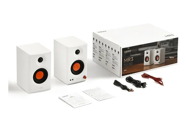 The Edifier MR3 is a speaker system designed for audio performance, suitable for studio monitoring. With Hi-Res Audio support and a maximum sampling rate of 96 kHz, it provides sound clarity across a frequency response of 58 - 40,000 Hz. The integrated Class D amplifier ensures audio output while maintaining a signal-to-noise ratio of 85 dB. Connectivity options include Bluetooth 5.4 for wireless streaming and various wired inputs, catering to diverse audio sources. The speaker system features an MDF body along with silk drivers for sound quality, making it a choice for music enthusiasts and professionals.