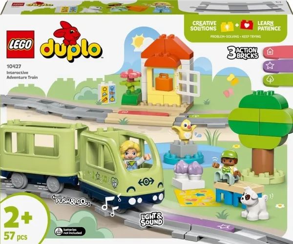 Setin 3 toimintopalikkaa herättävät leikit eloon, sillä lelujuna pitää aitoja ääniä ajaessaan palikoiden yli. Leikki-ikäisen ennakointitaidot kehittyvät hänen arvaillessaan, mikä ääni kuuluu seuraavaksi. Lapset voivat käyttää myös erityistä mukautettavaa palikkaa. Se soittaa ääniä, jotka lapset ovat itse äänittäneet ilmaisella LEGO® DUPLO® Interactive Trains sovelluksella. Sovelluksen avulla junaa voi myös ohjata mobiililaitteella.