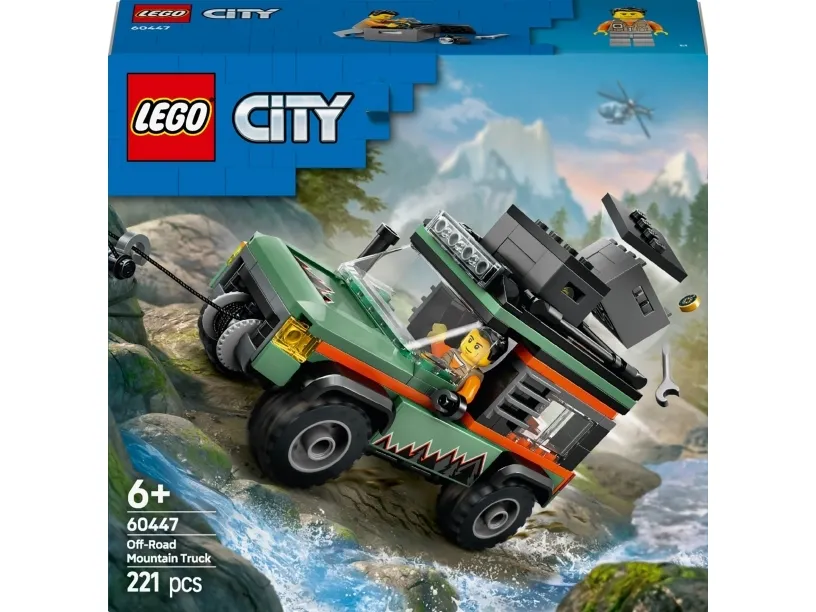 Yli 6-vuotiaille sopivan LEGO® City Nelivetoinen vuoristomaastoauto (60447) seikkailusetin parissa lapset suuntaavat vuoristoon. Vanttera maasturi on täynnä yksityiskohtia ja tarvikkeita, joihin lukeutuvat katolla olevat säilytyslaatikot, työkalut, muhkeat renkaat ja toimiva vinssi matkan varrelle sattuvista jyrkistä paikoista selviytymiseen. Menopelin snorkkelia painamalla konepelti ponnahtaa auki moottorin korjaamista varten. Nappaa vielä mukaan seikkailijan minihahmo, niin leikit voivat alkaa.