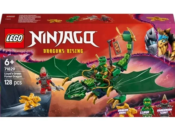 Yli 6-vuotiaat pojat ja tytöt suuntaavat yläilmoihin NINJAGO® Lohikäärmeiden nousu ‑TV-sarjan 3. kaudelta tuttuihin seikkailuihin Lloydin metsänvihreä lohikäärme (71829) ‑rakennussetin parissa. Setti sisältää huikean lohikäärmeen, jonka pyrstön, kaulan, kädet, jalat ja suuret siivet voi asetella eri asentoihin ja jonka selässä on satula minihahmolle. Tässä LEGO® NINJAGO lohikäärmesetissä on mukana 2 minihahmoa – Lloyd kultaisine katanamiekkoineen ja pahamaineinen dragonialainen tiedustelija kirveineen – sekä kultainen pikkulohikäärme, jotka innostavat lapset jännittäviin roolileikkeihin. LEGO NINJAGO sarjan rakennussetit sisältävät robotteja, ajoneuvoja ja temppeleitä, joiden parissa lapset voivat uppoutua mielikuvitusmaailman seikkailuihin ninjasankareidensa kanssa. Kaikki mielikuvitusleikkeihin innostavat lelut voi rakentaa LEGO Builder sovelluksella, joka opastaa sinua ja lastasi helpossa ja intuitiivisessa rakennusseikkailussa.