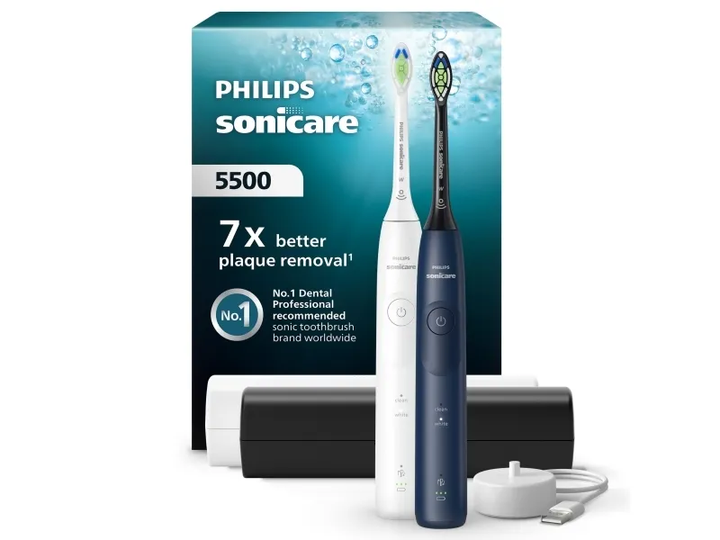 The Philips Sonicare 5500 series HX7119 electric toothbrush provides an advanced oral health care solution. This toothbrush features a Smartimer and BrushPacer to ensure effective brushing time. The interval timer encourages optimal brushing duration, while the pressure sensor protects gums against excessive force, promoting healthier teeth and gums. With a powerful oscillation rate of 62,000, it delivers superior plaque removal compared to manual toothbrushes, helping achieve a brighter, cleaner smile. Included are essential accessories that enhance user experience, such as a travel case for portability and a charging stand for easy storage. The navy blue toothbrush handle is stylish and ergonomic, ensuring comfort during use. With a lithium-ion battery providing up to 21 days of use on a single charge, this toothbrush combines convenience with efficiency for maintaining oral health.