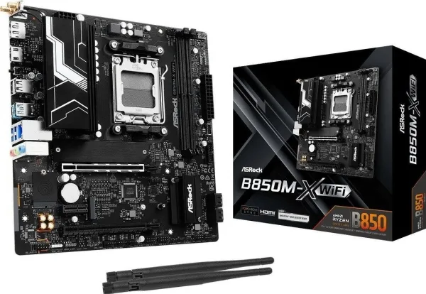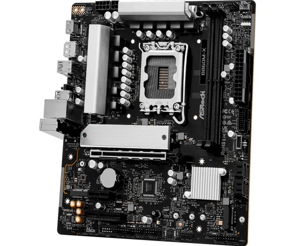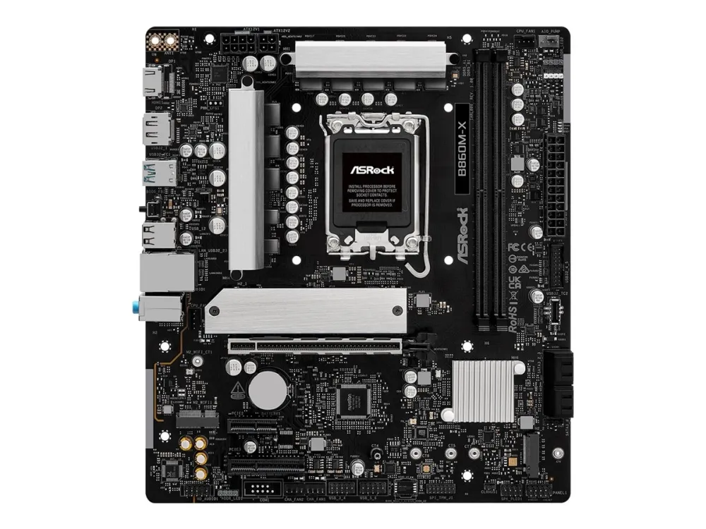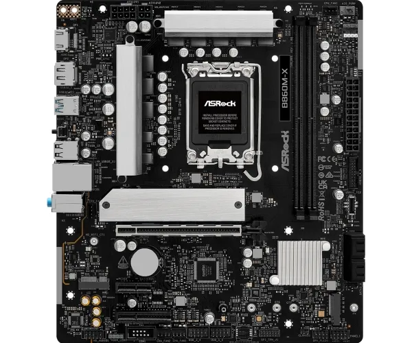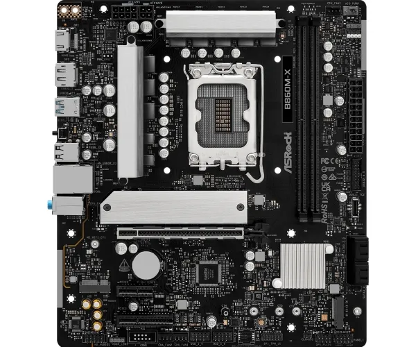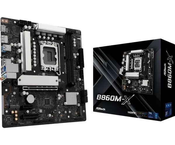 The ASRock B860M-X motherboard is designed for performance and efficiency, accommodating Intel Core Ultra processors from Series 2. This micro ATX form factor motherboard supports DDR5 SDRAM with a maximum speed of up to 9066 MHz when overclocked, ensuring high-speed data transfer and enhanced multitasking capabilities. Equipped with two DIMM slots, it allows for dual-channel memory architecture and is compatible with Intel Extreme Memory Profiles (XMP) 3.0 and AMD EXPO technology to optimize memory performance. For ample connectivity, the B860M-X features multiple interfaces including USB 3.2 Gen 1, USB-C 3.2 Gen 2x2, HDMI, and 2.5 Gigabit Ethernet for swift data transmission. The audio capabilities are supported by a high definition audio card with an 8-channel audio codec from Realtek. This motherboard integrates advanced features such as ASRock Instant Flash, a BIOS FlashBack button, and 7+1+1+1+1 Power Phase Design, all housed within a sturdy aluminum heatsink design to manage thermal performance effectively.