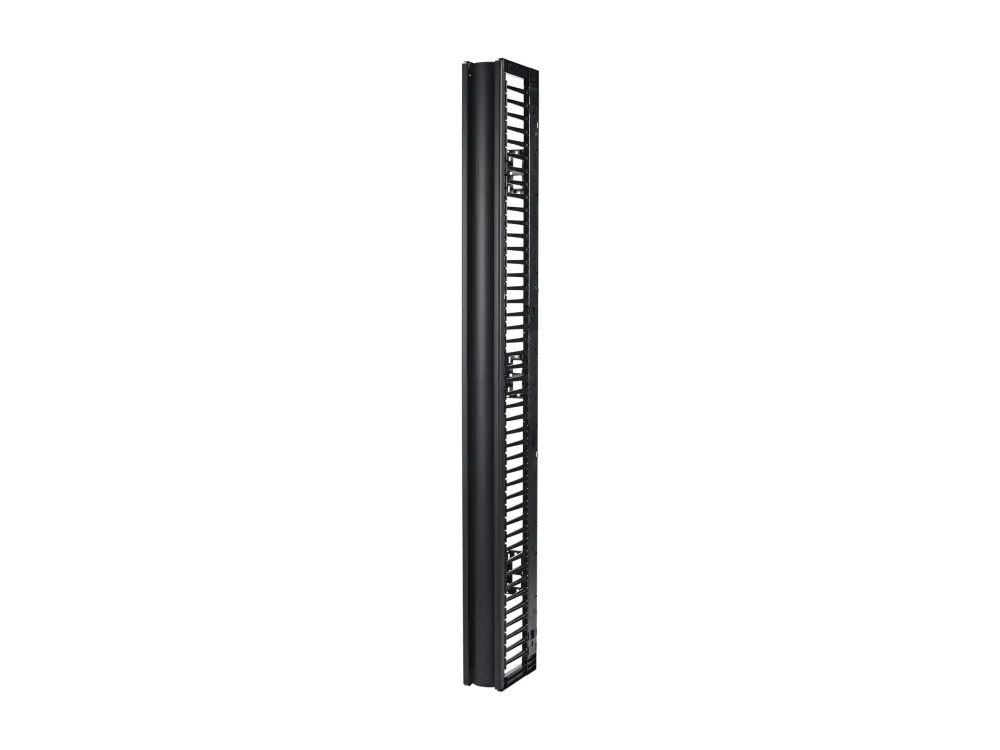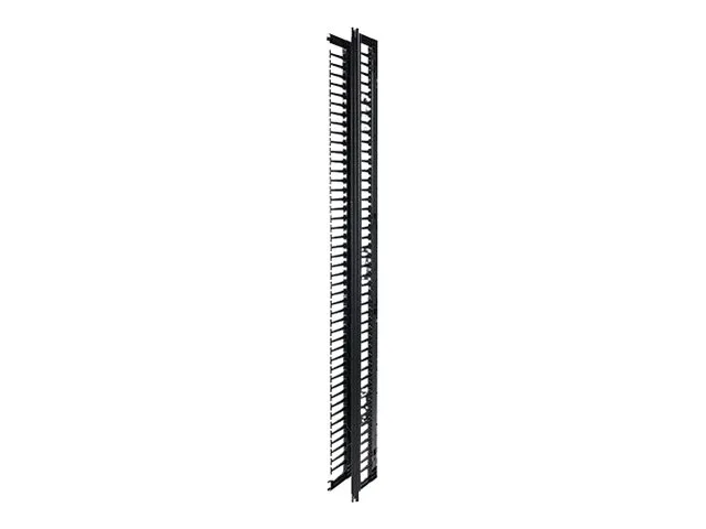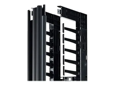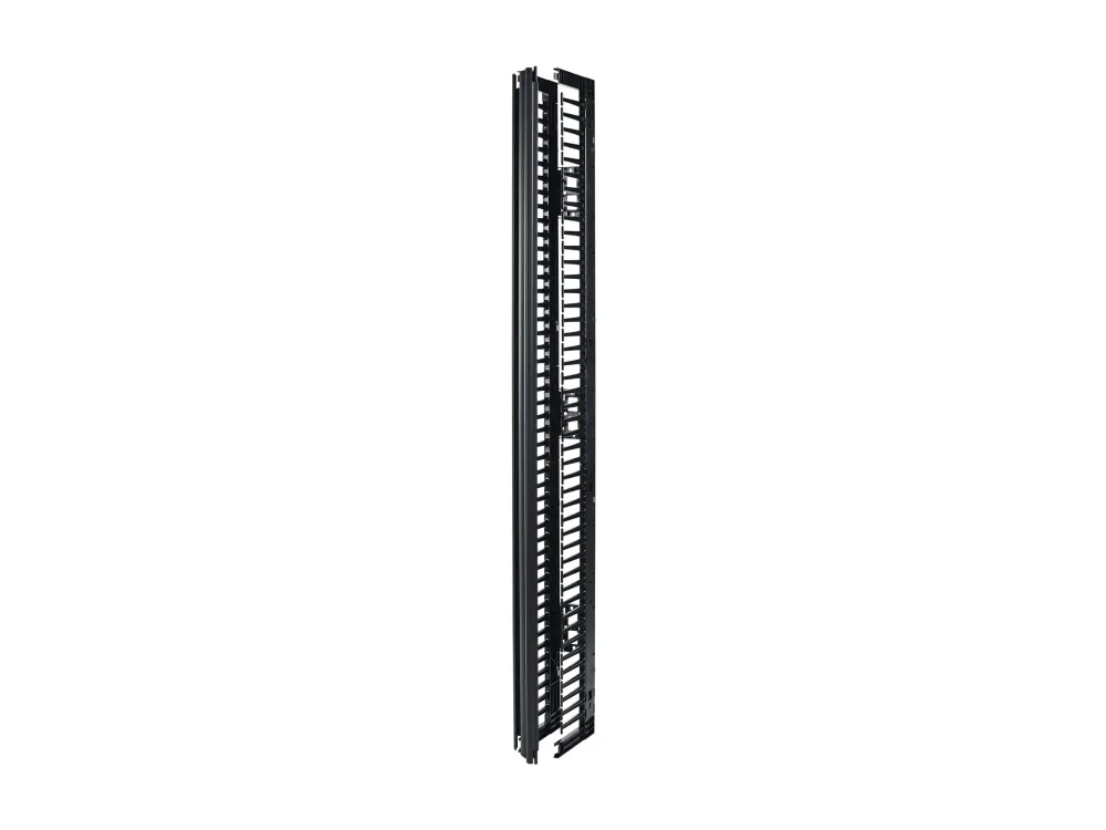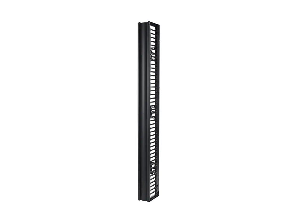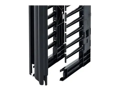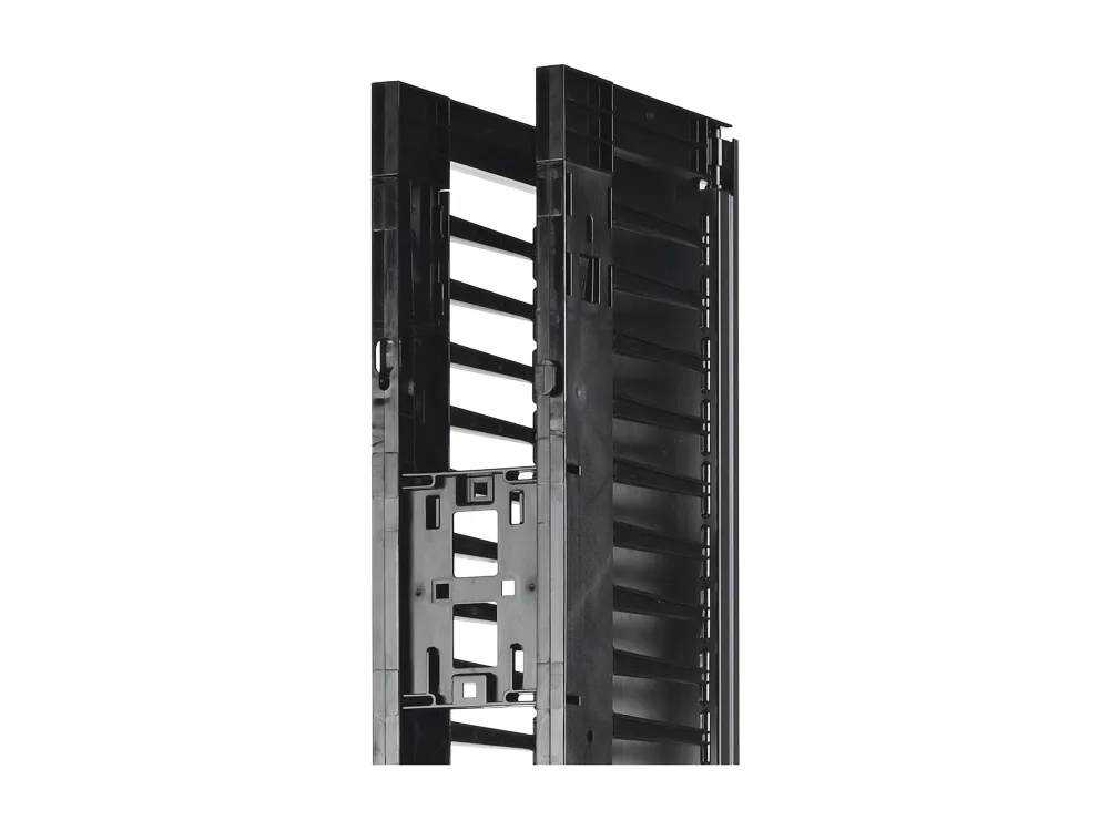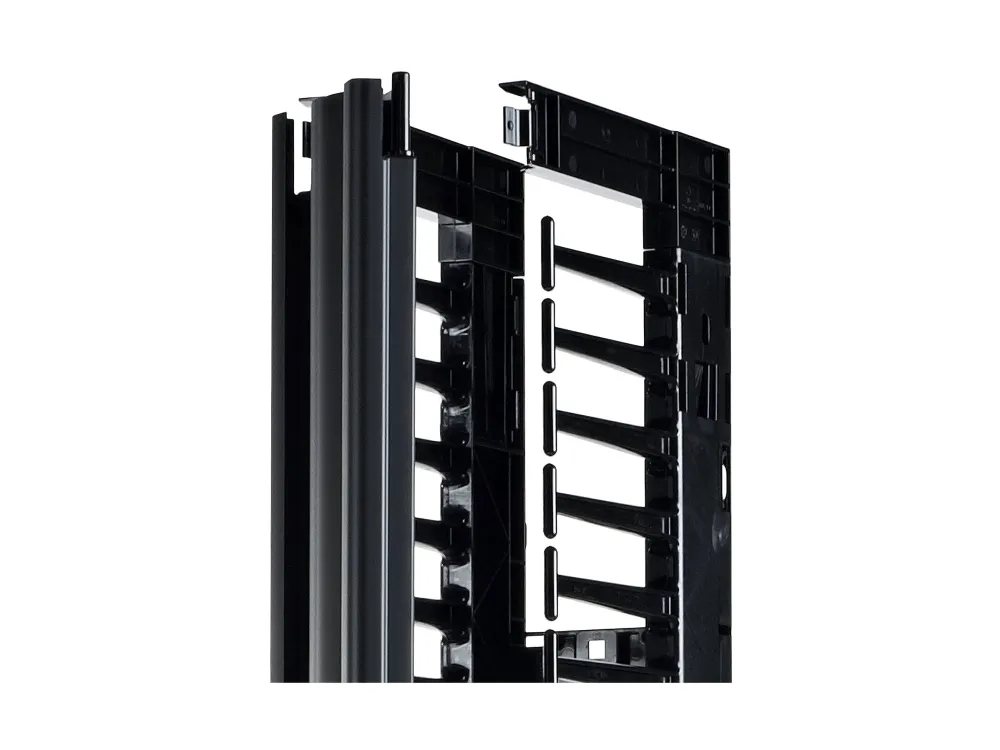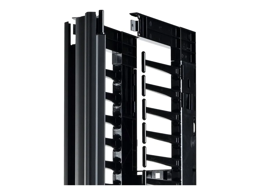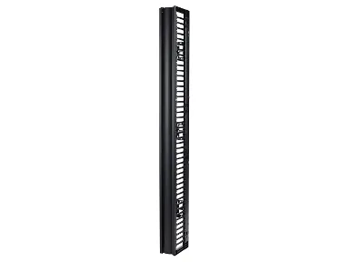 This 6” wide, high capacity vertical cable manager for 2 and 4 Post open frame racks features a single-sided cable channel with multiple internal cable tie-off locations and smooth plastic fingers at 1U increments for organized patching applications.