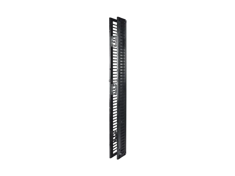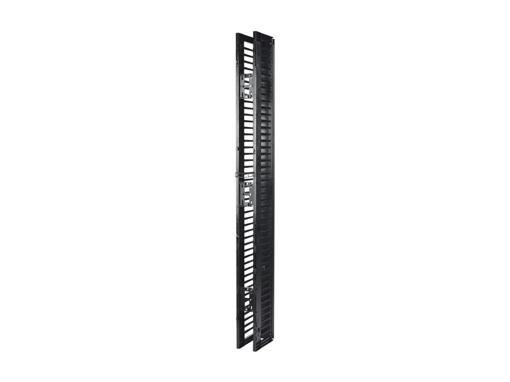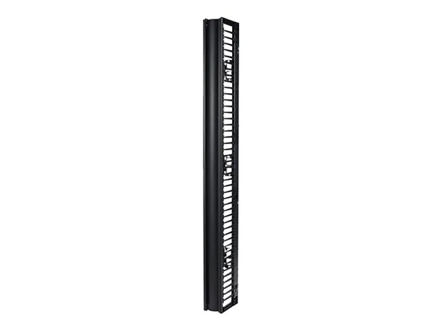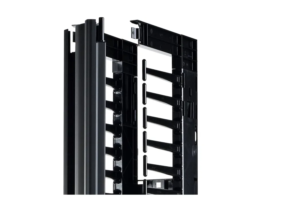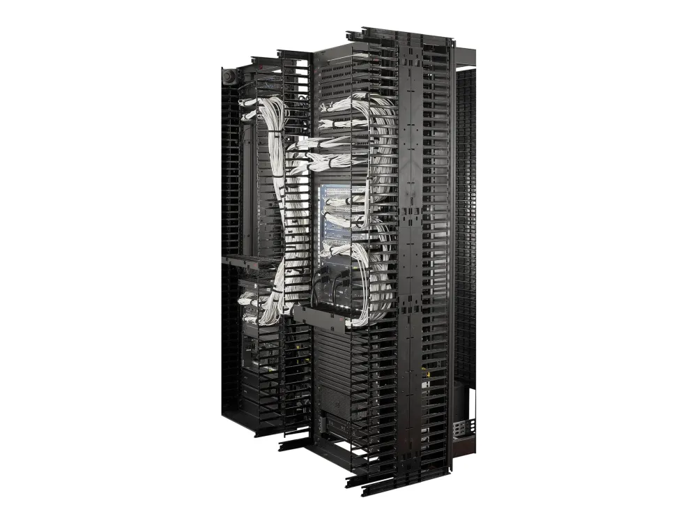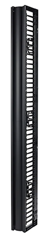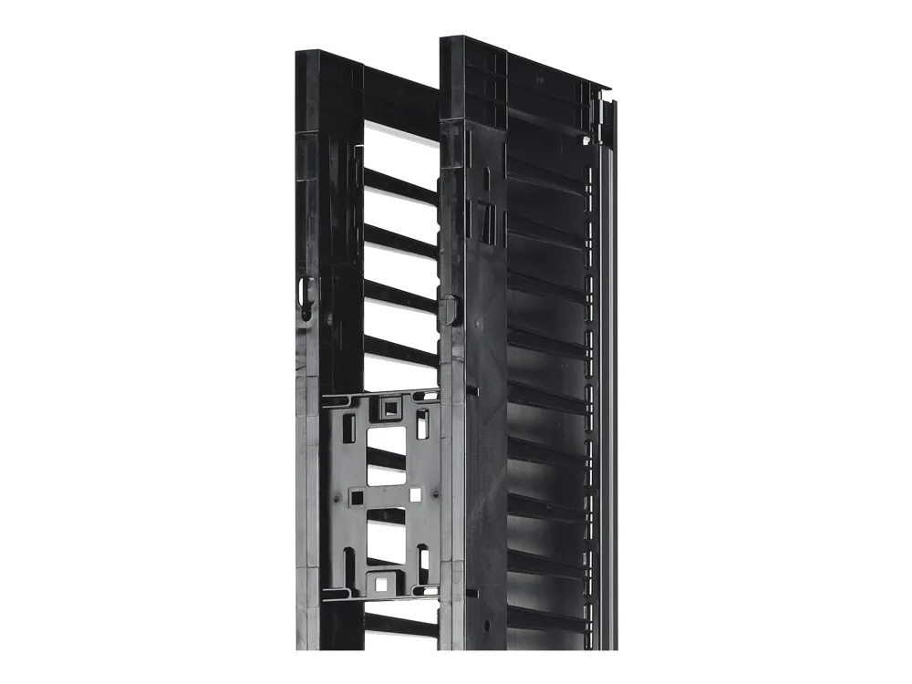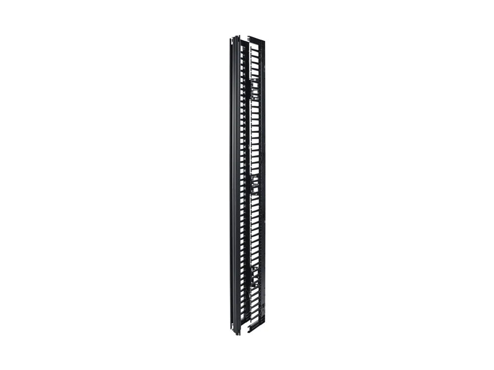 This 6” wide, high capacity vertical cable manager for 2 and 4 Post open frame racks features a single-sided cable channel with multiple internal cable tie-off locations and smooth plastic fingers at 1U increments for organized patching applications.