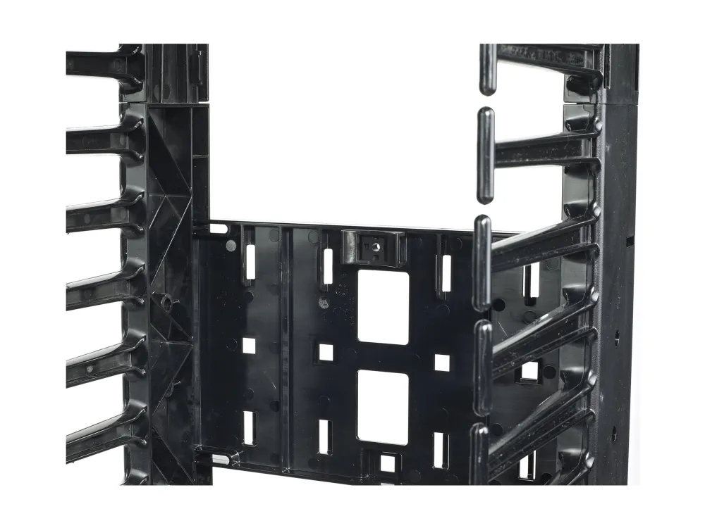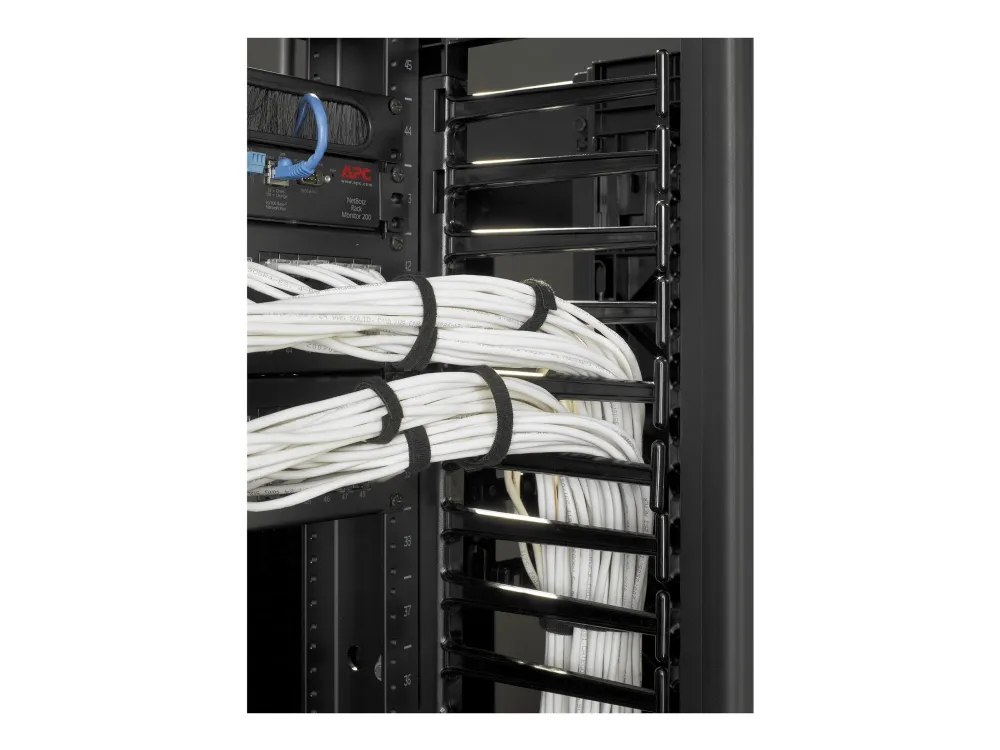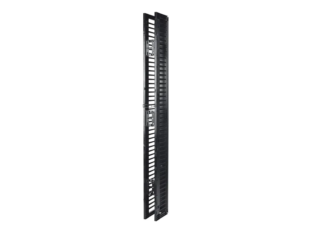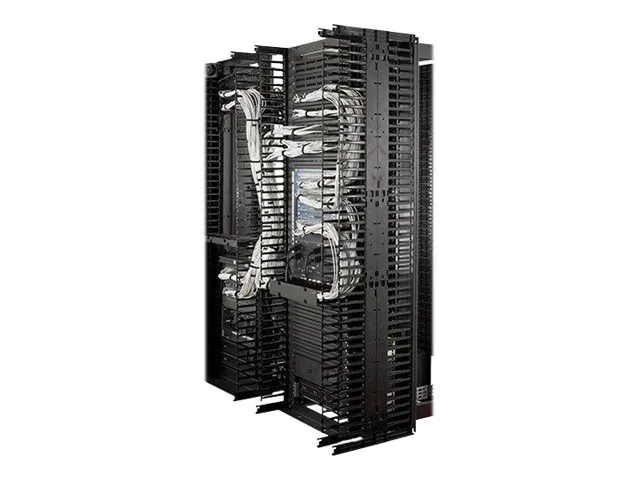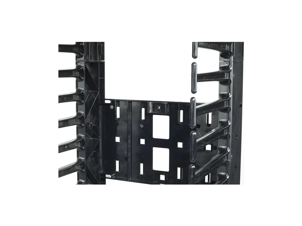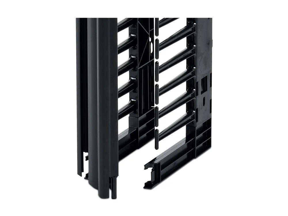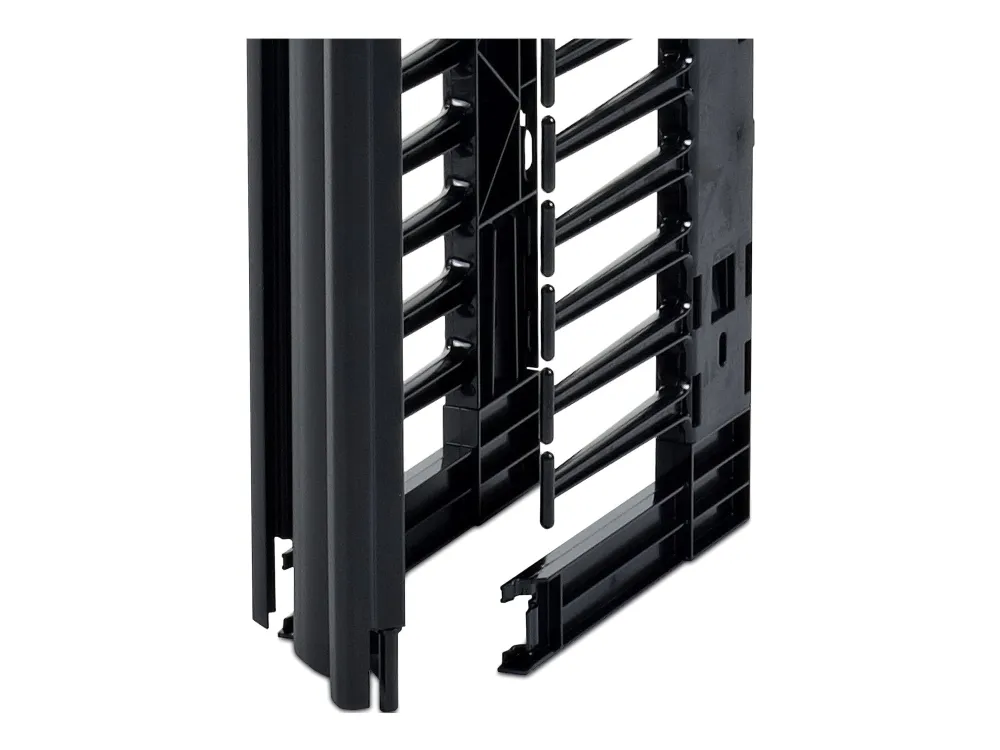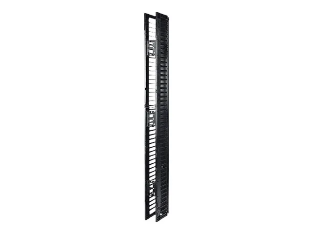 This 6” wide, high capacity vertical cable manager for 2 and 4 Post open frame racks features a single-sided cable channel with multiple internal cable tie-off locations and smooth plastic fingers at 1U increments for organized patching applications.
