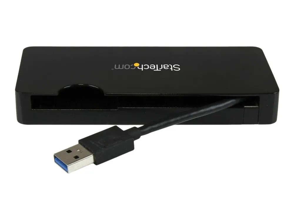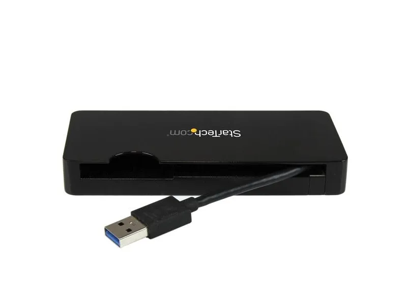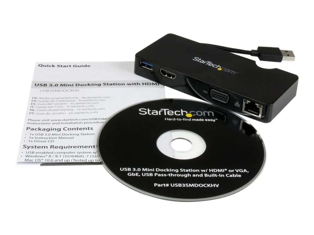 A versatile solution for connecting an additional display to your laptop, the travel docking station offers HDMI video output with audio, or VGA video output, providing two popular interfaces for connecting a television, projector, or monitor as a second display, with support for resolutions up to 2048x1152 (QWXGA). Leveraging the high-bandwidth (5Gbps) USB 3.0 interface to deliver flexible video output, a USB 3.0 hub port, and Gigabit Ethernet, you can quickly set up a multi-functional workstation while on the run, without sacrificing one of your laptop USB ports.