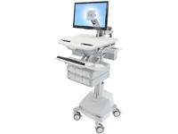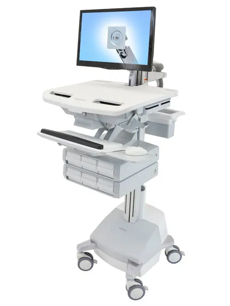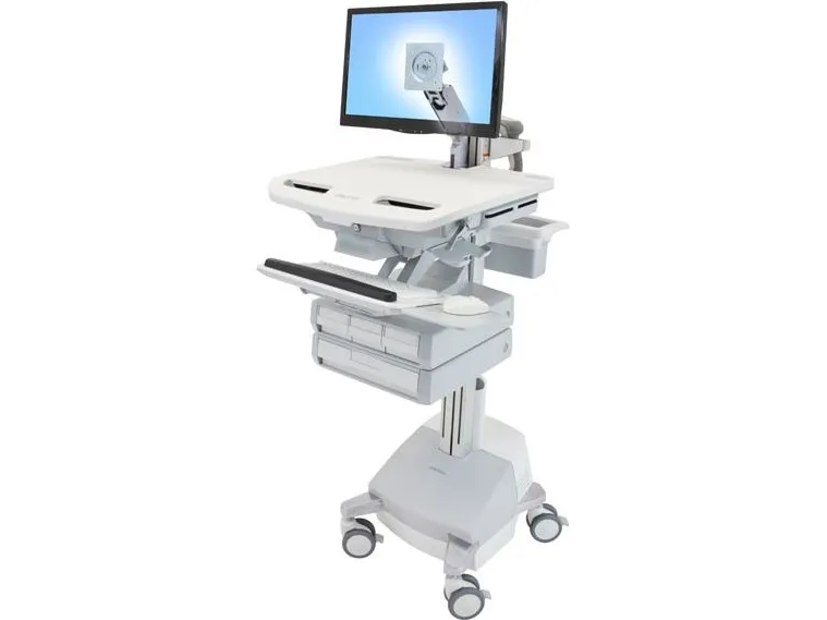 Stay productive and on the go with the certified power system. This innovative, truly ergonomic and easy-to-maneuver healthcare cart features sit-to-stand height adjustment, side-to-side LCD and keyboard motion, bi-focal viewing and an adjustable back-tilt keyboard tray. Its auto-locking drawer system enables simple and efficient management of non-controlled medication.