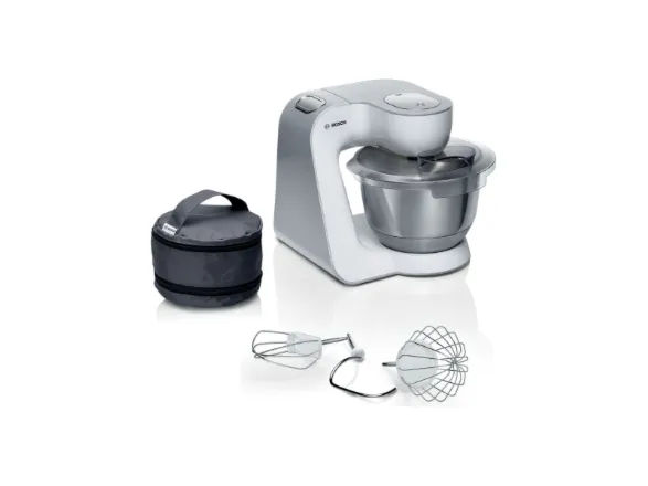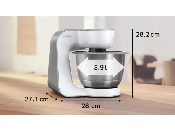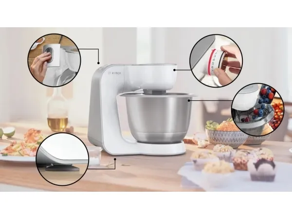 The Bosch Serie 4 MUM58200 kitchen machine offers a variety of functionalities, including kneading, mixing, beating, and whipping, making it a versatile addition to any kitchen. With a 3.9-liter stainless steel bowl, it is designed to meet various culinary needs while providing excellent durability and ease of cleaning. The included attachments such as the dough hook, whisk attachment, and balloon whisk allow for flexible cooking and baking options. The machine features a tilting head for easy access, non-slip feet for stability during use, and a soft start function to prevent splattering.