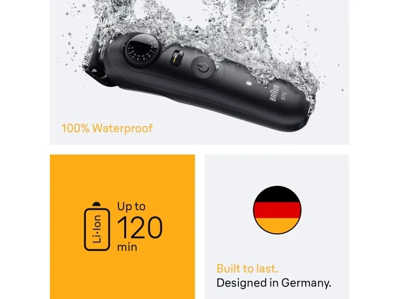 Built to last: 100% waterproof trimmer for men with long-lasting Li-Ion battery and up to 120-min cordless runtime.Braun BeardTrimmer 5 BT5560. Minimum hair length: 0.5 mm, Maximum hair length: 2 cm, Control type: Buttons, Rotary. Product colour: Black. Power source: Battery, Operating time: 120 min, Battery type: Built-in battery. Width: 42 mm, Depth: 45 mm, Height: 156 mm. Package width: 130 mm, Package depth: 60 mm, Package height: 252 mm