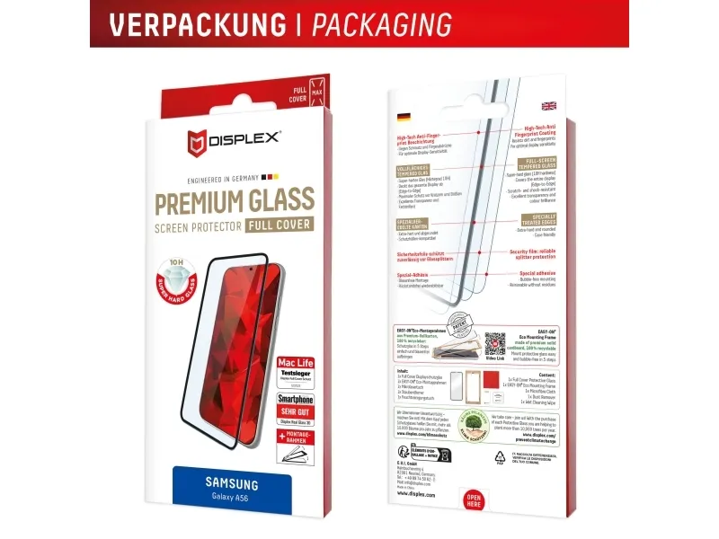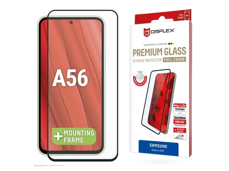Displex Premium Screen Protector (Full Cover, 10H) for Samsung Galaxy A56, Eco Mounting Frame, Full Cover. Brand compatibility: Samsung, Compatibility: Galaxy A56. Dry application. Protection features: Dirt resistant, Dust resistant, Impact resistant, Scratch resistant, Shock resistant. Material: Tempered glass, Product colour: Black, Transparent. Quantity per pack: 1 pc(s)