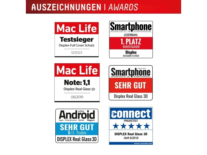 All Displex protective glasses have a surface hardness of 10H and are therefore not only more scratch-, break- and shock-resistant than comparable brand products, but even surpass sapphire glass, which is used in luxury watches and has a hardness of 9H.